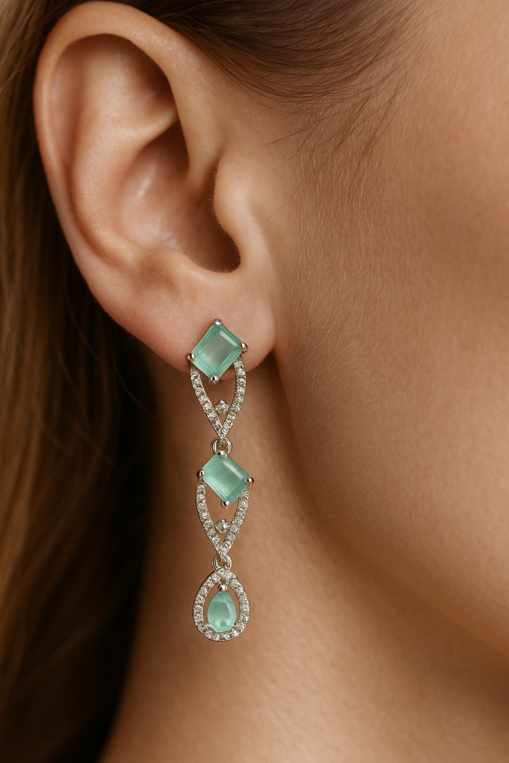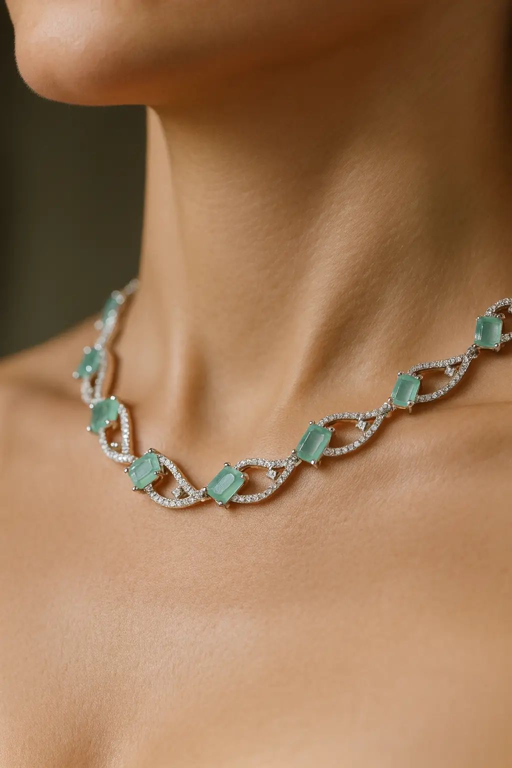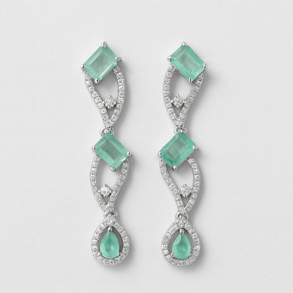 Elegant and modern, this necklace set features square-cut aqua-green crystals beautifully linked with American diamond halos in a flowing infinity design. The matching drop earrings, at 5.5 cm, mirror the necklace’s graceful curves and add just the right amount of sparkle. Lightweight yet luxurious, this set sits at an adjustable princess length of 38–46 cm, making it ideal for evening wear, weddings, or festive occasions.