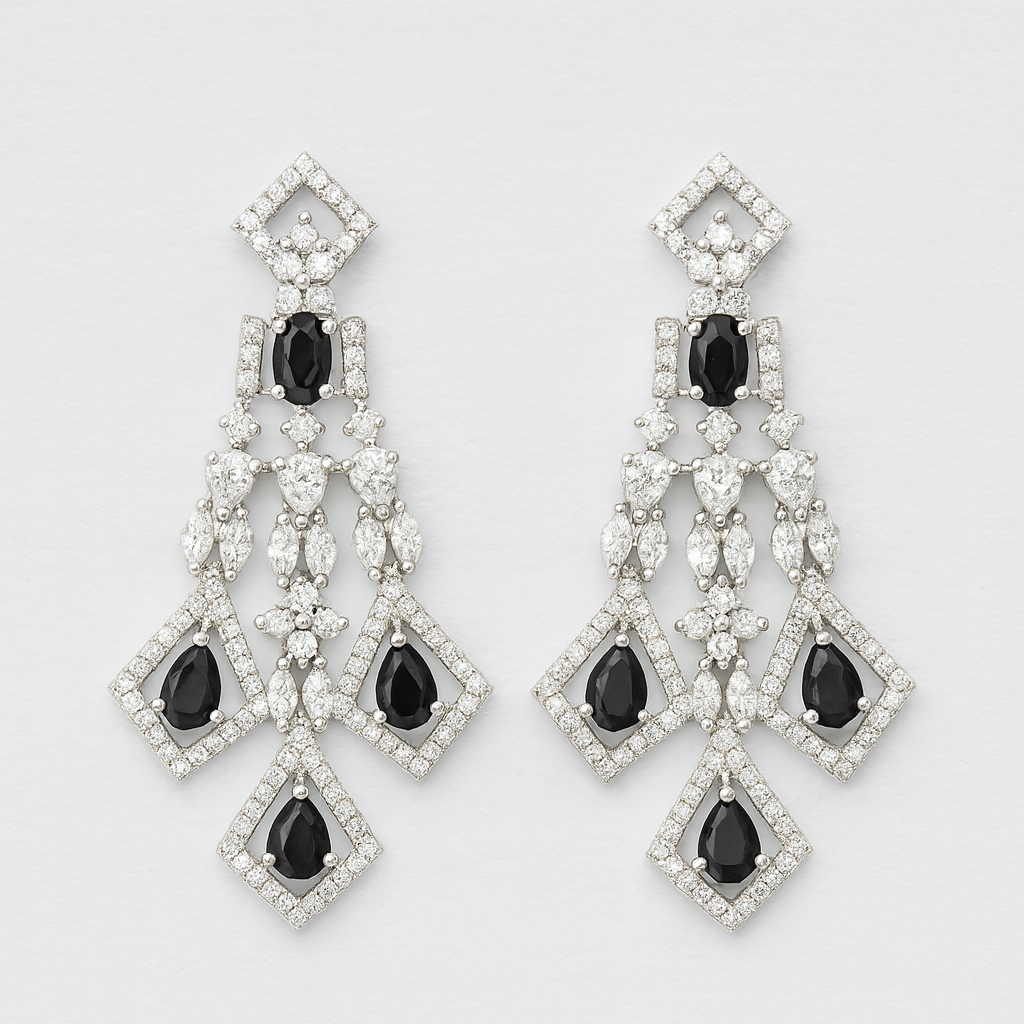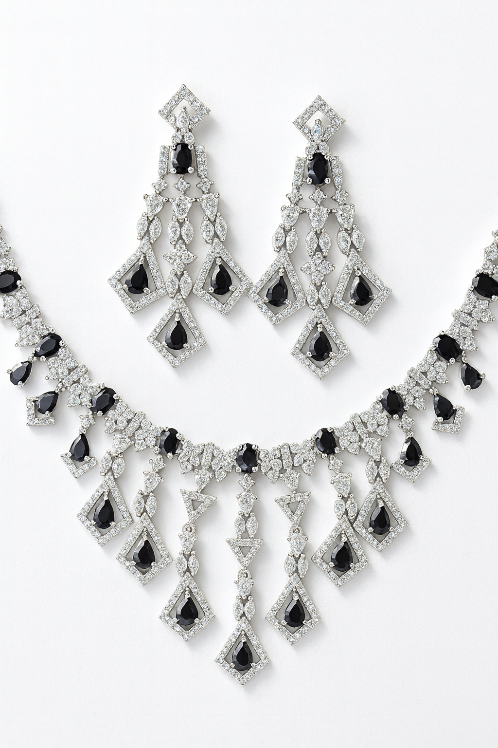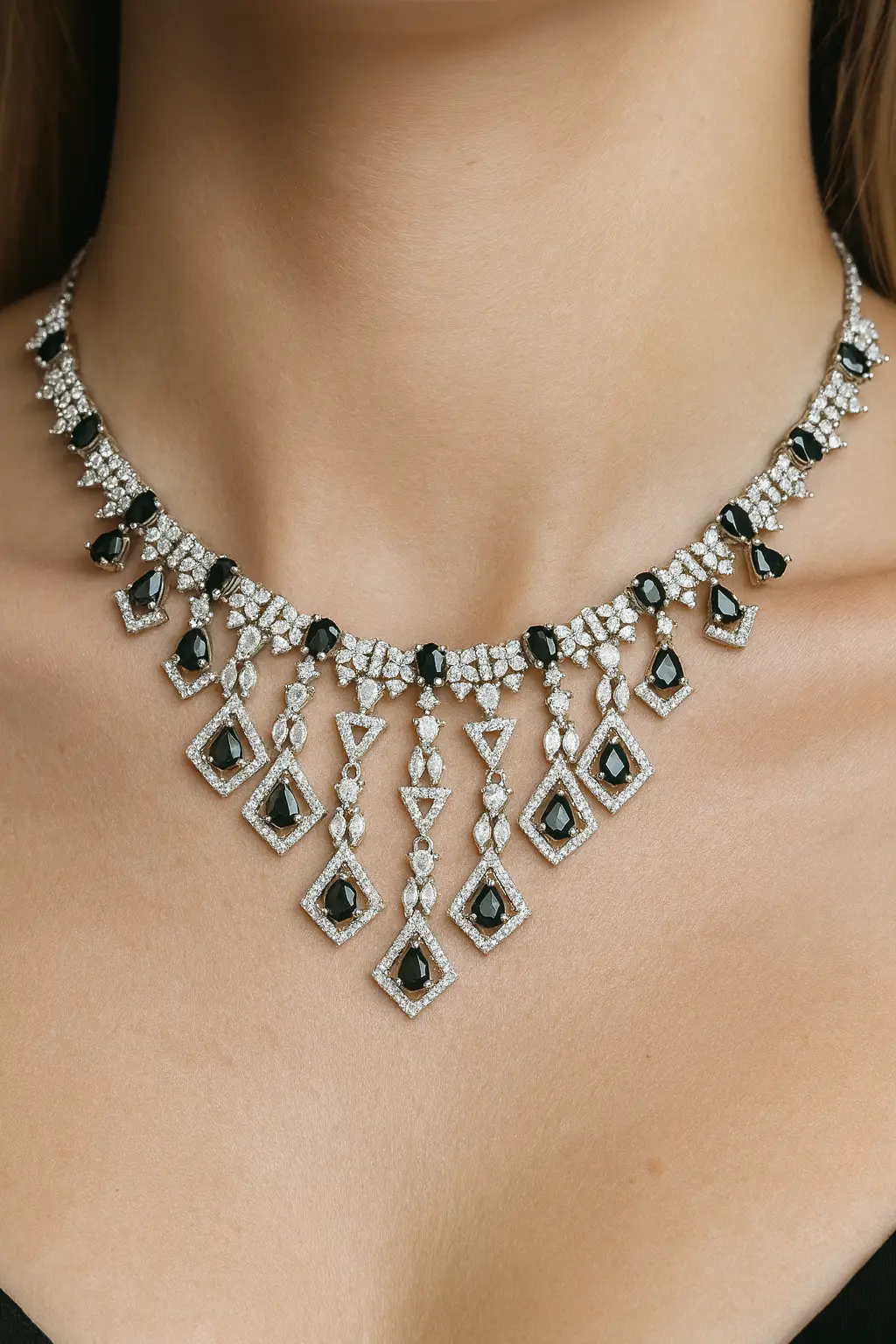 A striking necklace featuring bold black onyx paired with shimmering American diamonds. Set on a brass base with rhodium plating, it’s designed with cascading drops that add movement and elegance. Perfect for weddings, evening wear, or any occasion where you want a statement piece.