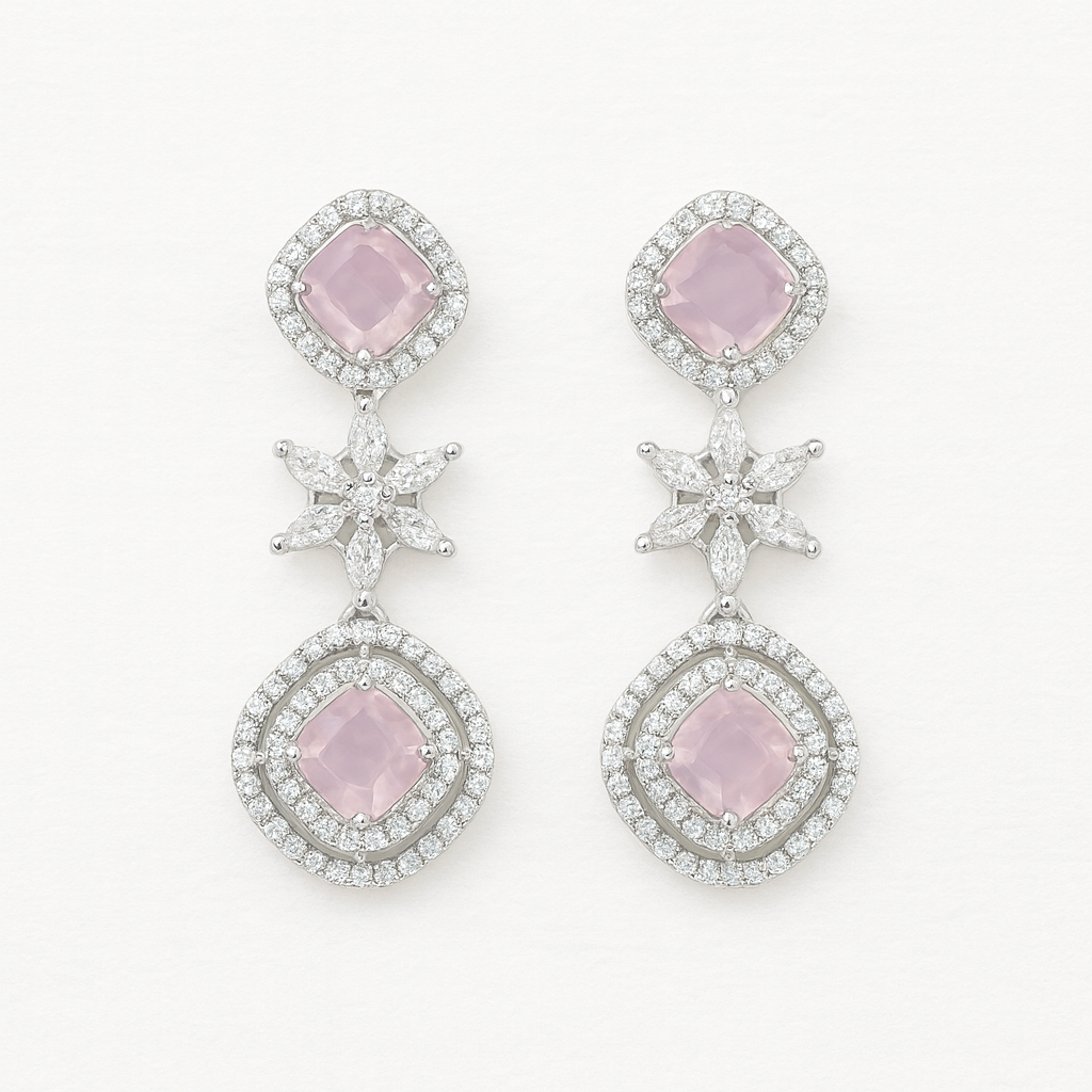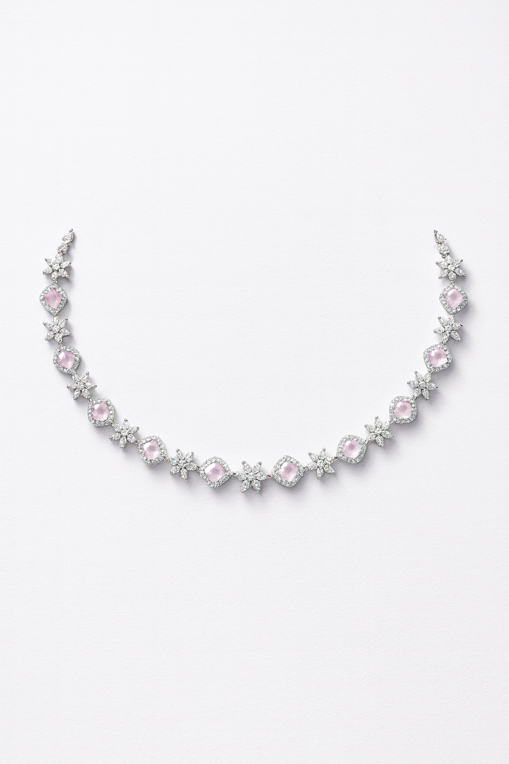Delicate and feminine, this necklace set features soft blush pink stones framed with sparkling American diamonds in a floral-inspired design. The alternating flower and cushion motifs create a romantic rhythm. Paired with matching drop earrings, this set is perfect for weddings, receptions, or evening occasions.