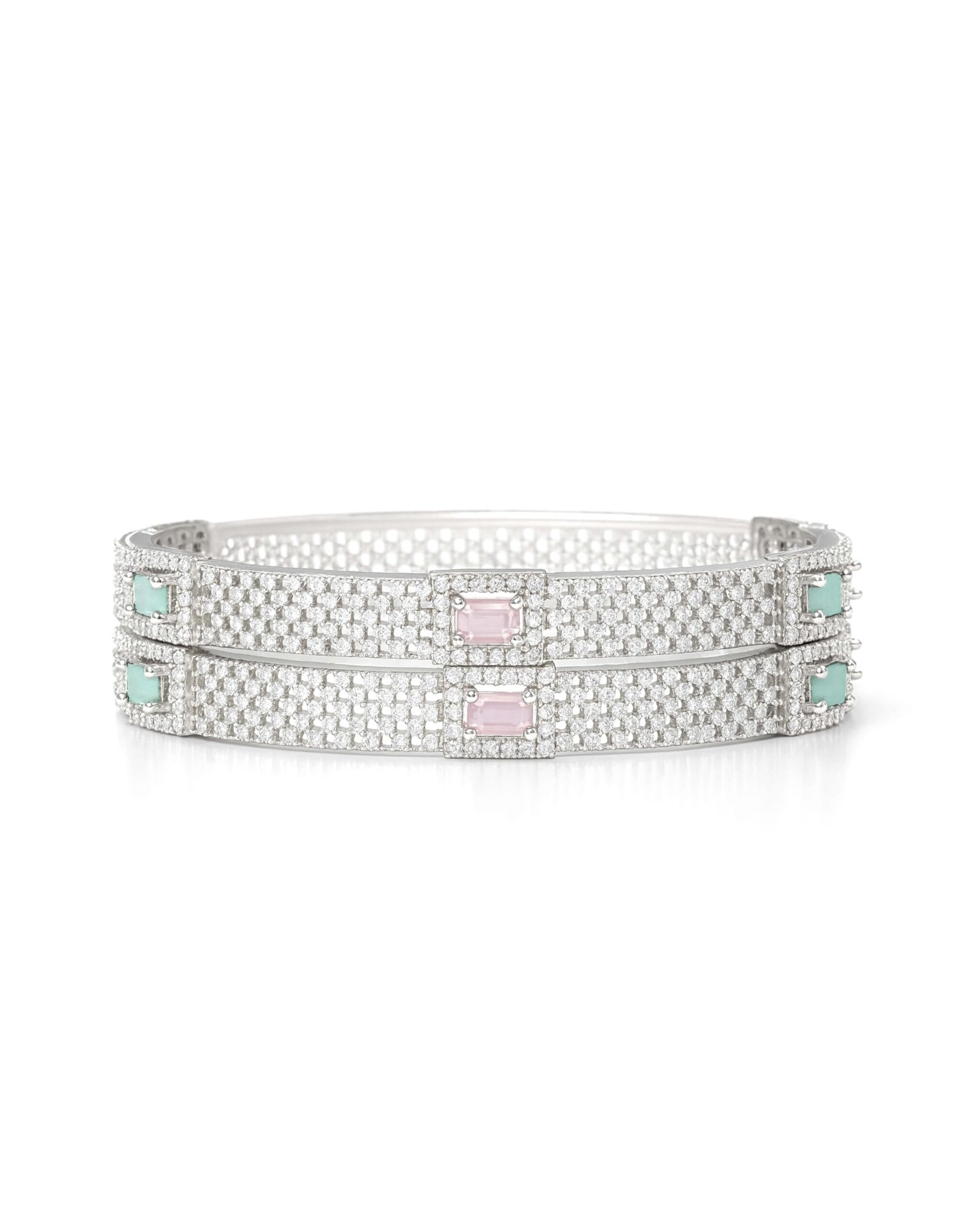 Radiating serene elegance, the Celestia Dual-Tone Pastel Bangles feature a meticulously set pavé diamond base adorned with delicate pastel baguette stones. Their sleek silhouette and modern geometric placement make them a timeless choice for both festive occasions and contemporary styling.
