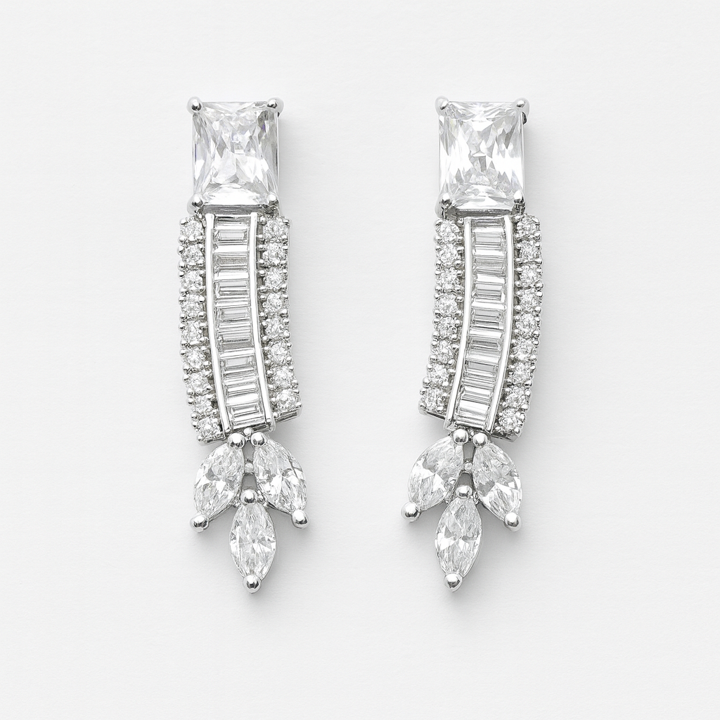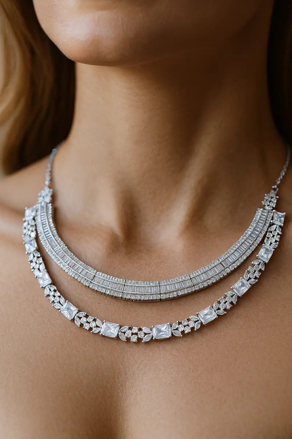 A masterpiece of modern elegance, this necklace set showcases a refined double-layer design crafted with baguette-cut and emerald-cut American diamonds. The upper row features a sleek arrangement of baguette diamonds, while the lower row dazzles with emerald-cut stones framed by marquise and round diamonds for added brilliance. Paired with matching 5 cm earrings, this necklace drapes gracefully at princess length, making it perfect for weddings, receptions, and grand occasions.