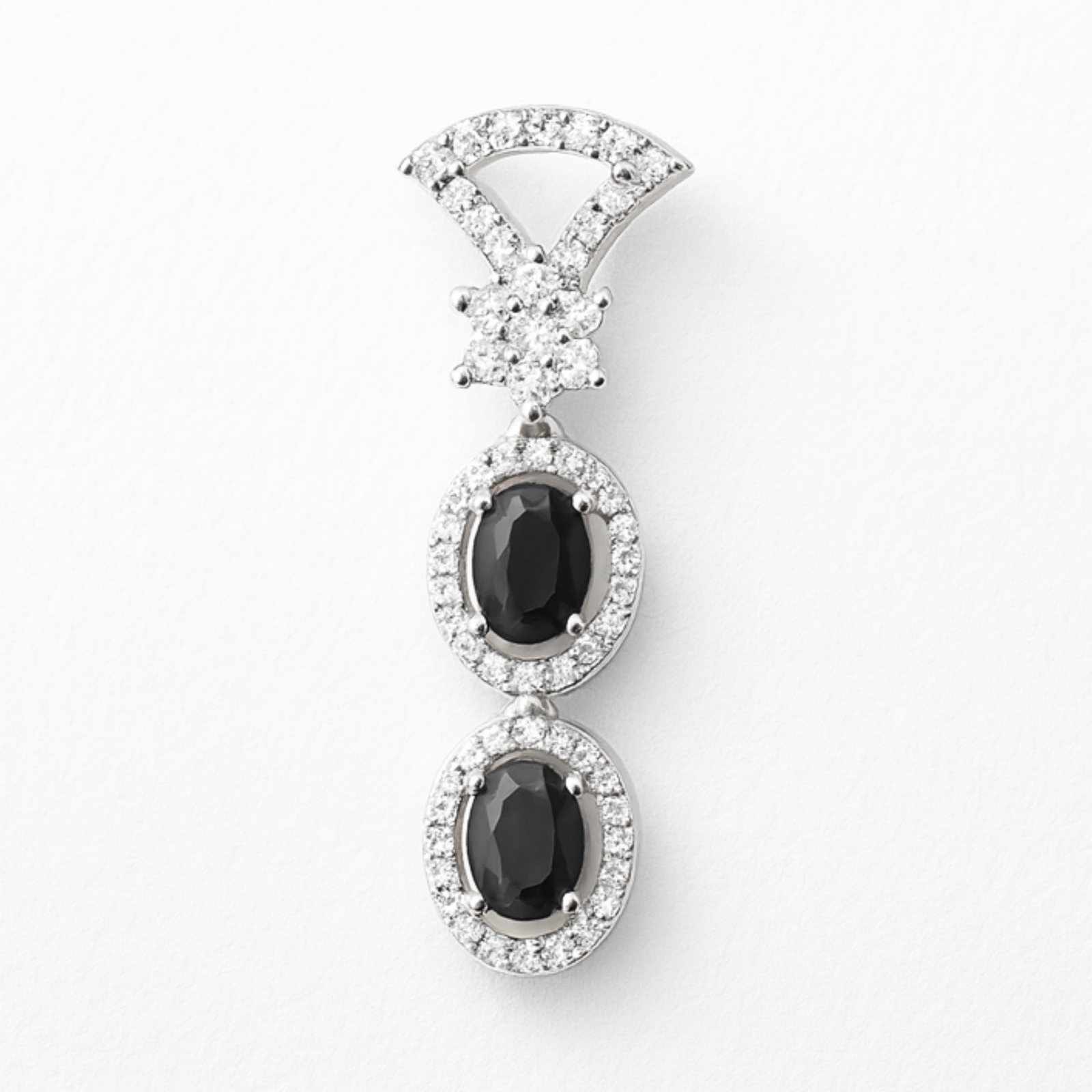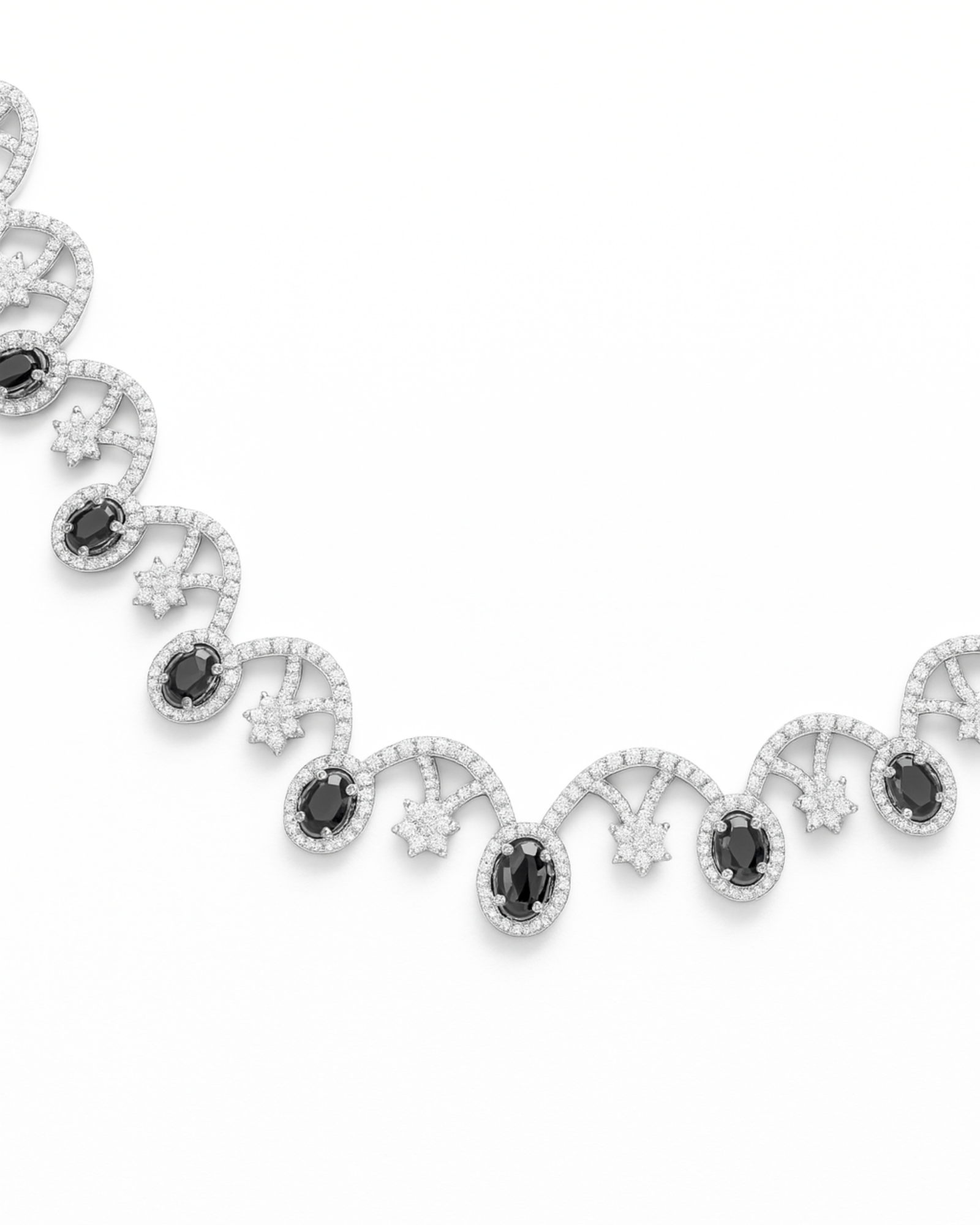 A graceful necklace featuring deep black oval stones framed with sparkling accents and star motifs, paired with elegant matching earrings for a refined statement look.