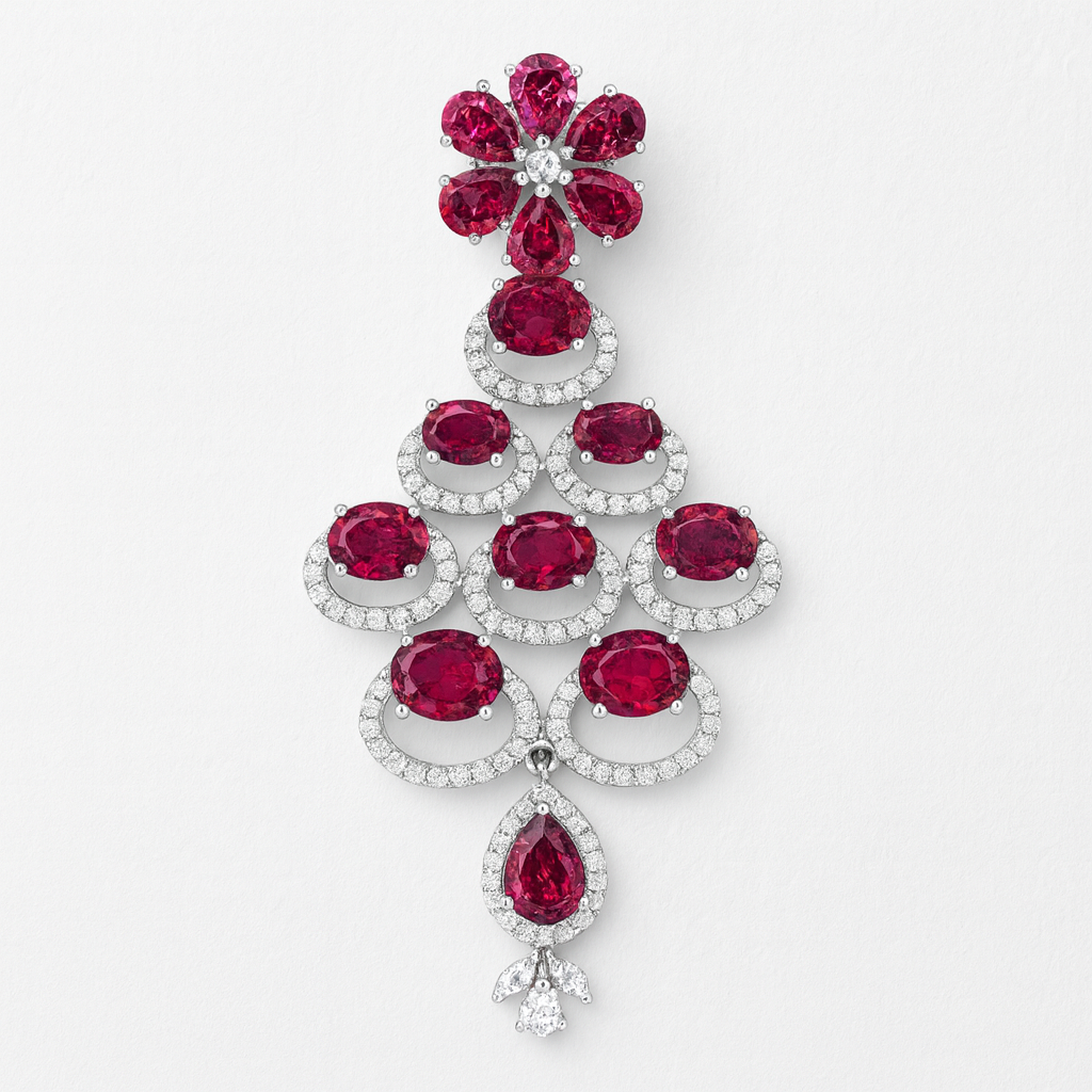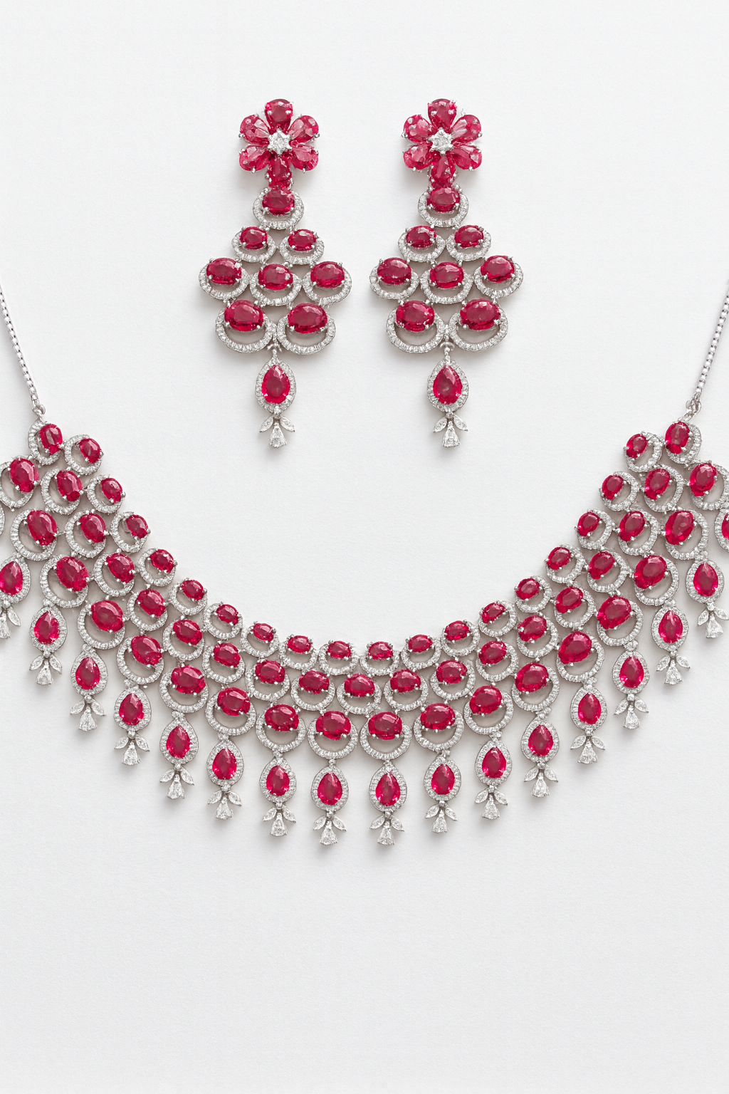 Turn heads with the Crimson Blossom Chandelier Necklace Set, featuring rows of deep ruby-red crystals framed with American diamonds. The grand floral-inspired earrings add drama and balance, making this an exquisite choice for weddings, galas, or festive occasions.