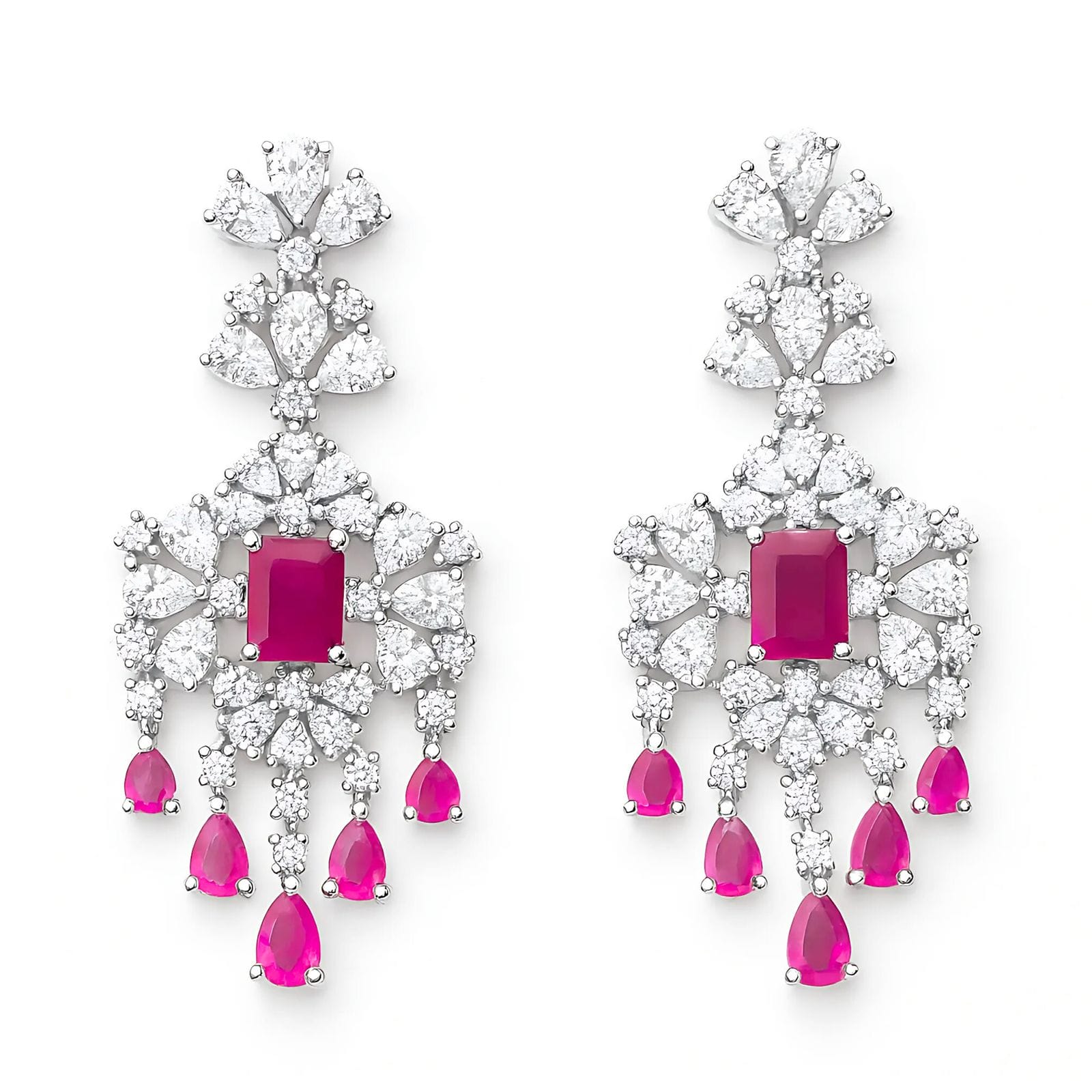 A radiant design featuring brilliant ruby drops framed by shimmering CZ blossoms, perfect for a statement of grace and luxury.
