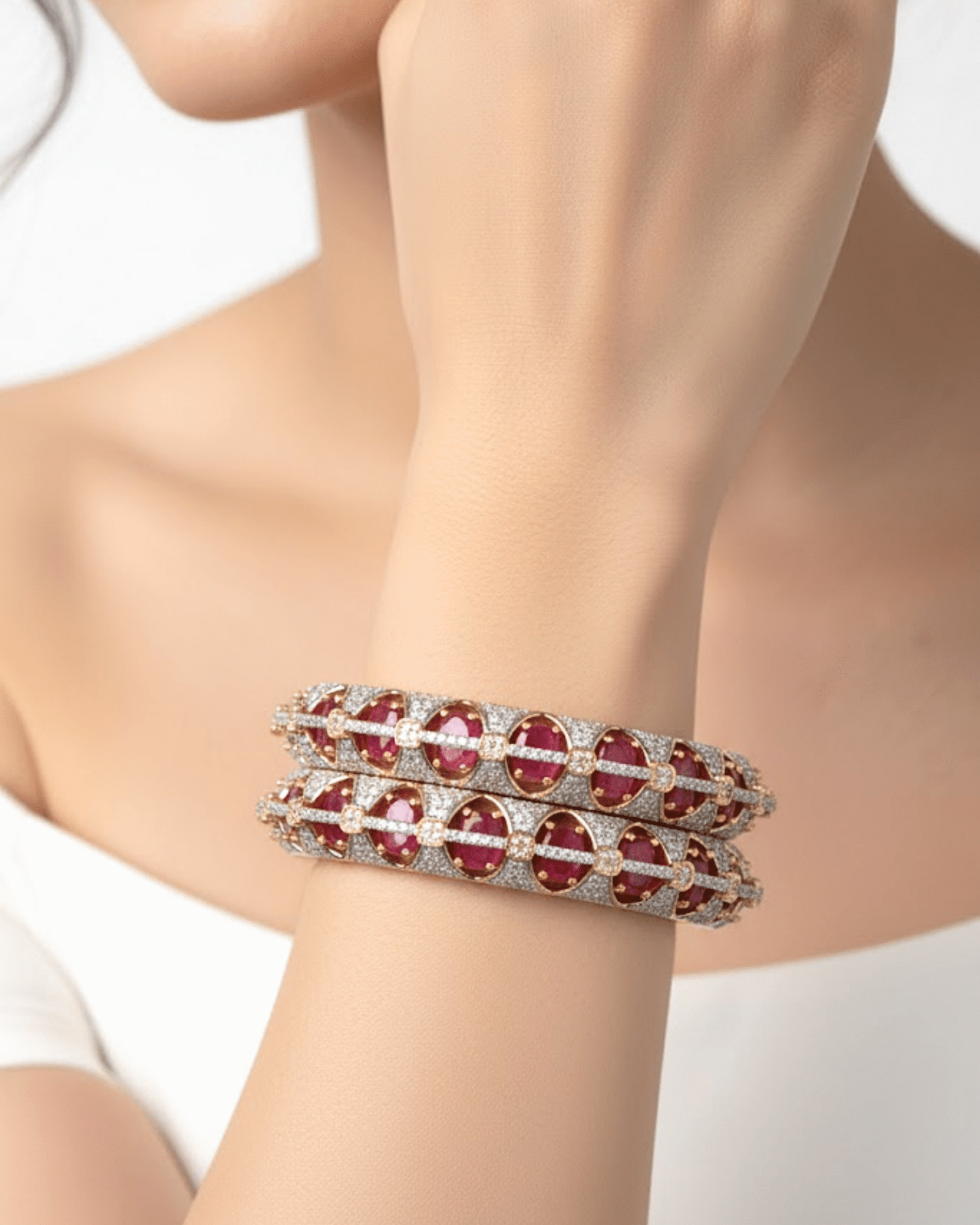 The Crimson Majesty Ruby Bangles captivate with deep oval ruby CZ stones set in an intricate halo design, accented by delicate diamond detailing. These bold and elegant bangles are perfect for weddings, festive occasions, or grand celebrations.
