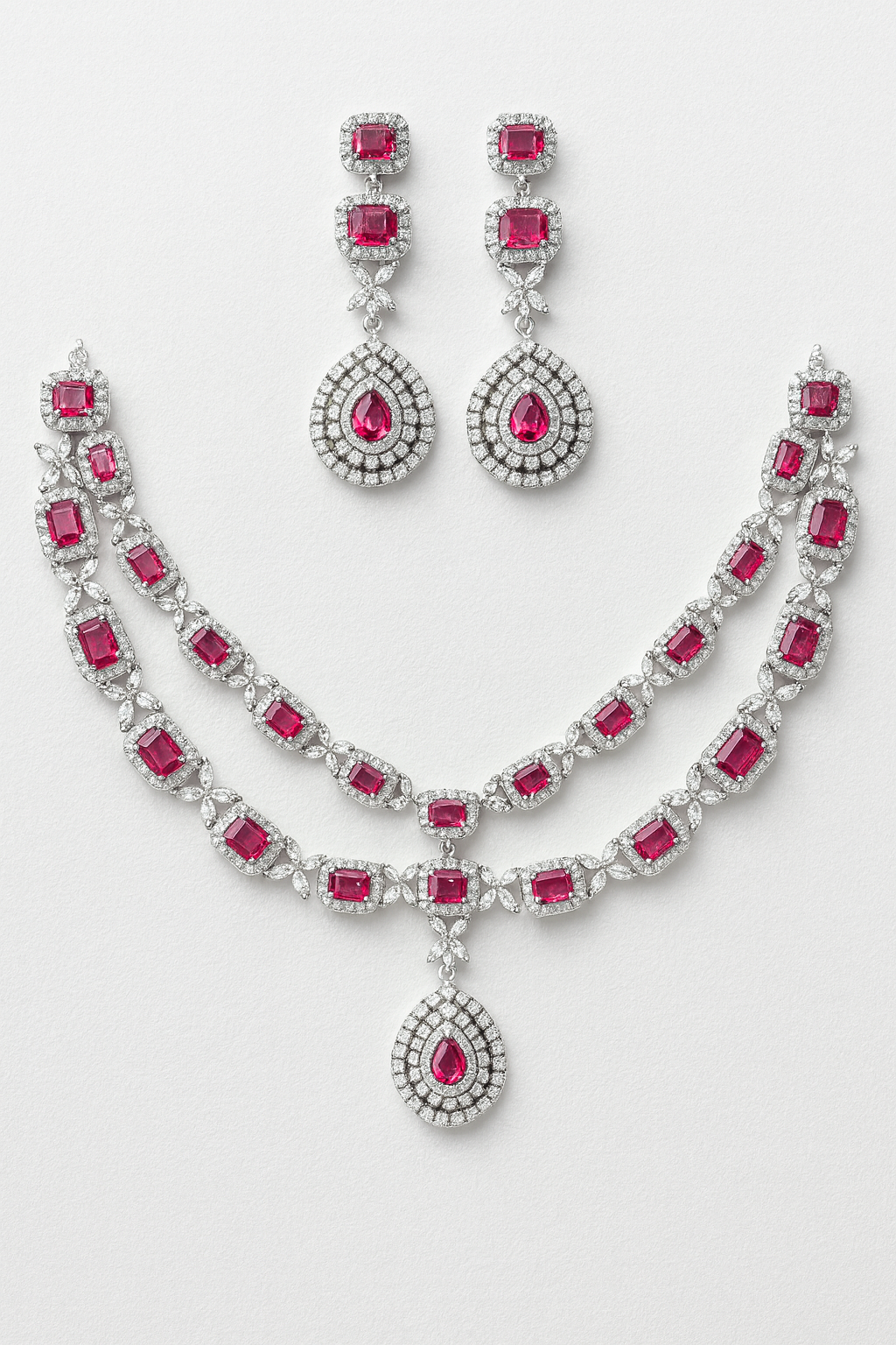 Elevate your style with the Crimson Majesty Ruby Necklace Set, featuring bold ruby-red crystals framed in shimmering American diamonds. The dual-layer necklace design with a teardrop pendant radiates timeless grace, while the 6 cm chandelier earrings complete the regal look. Adjustable between 42–48 cm, this set is perfect for weddings, receptions, or glamorous evenings.