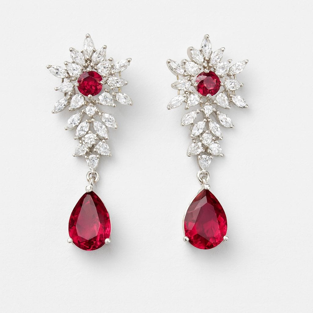 Designed to make a statement, this necklace set features vivid ruby-red stones paired with sparkling American diamonds in an elegant lattice design. The centerpiece teardrop ruby pendant adds a dramatic finish, while the princess length (42–48 cm) ensures it sits perfectly along the collarbone. Crafted on a brass base with rhodium plating and paired with matching drop earrings, this set is ideal for weddings, receptions, and evening occasions.
