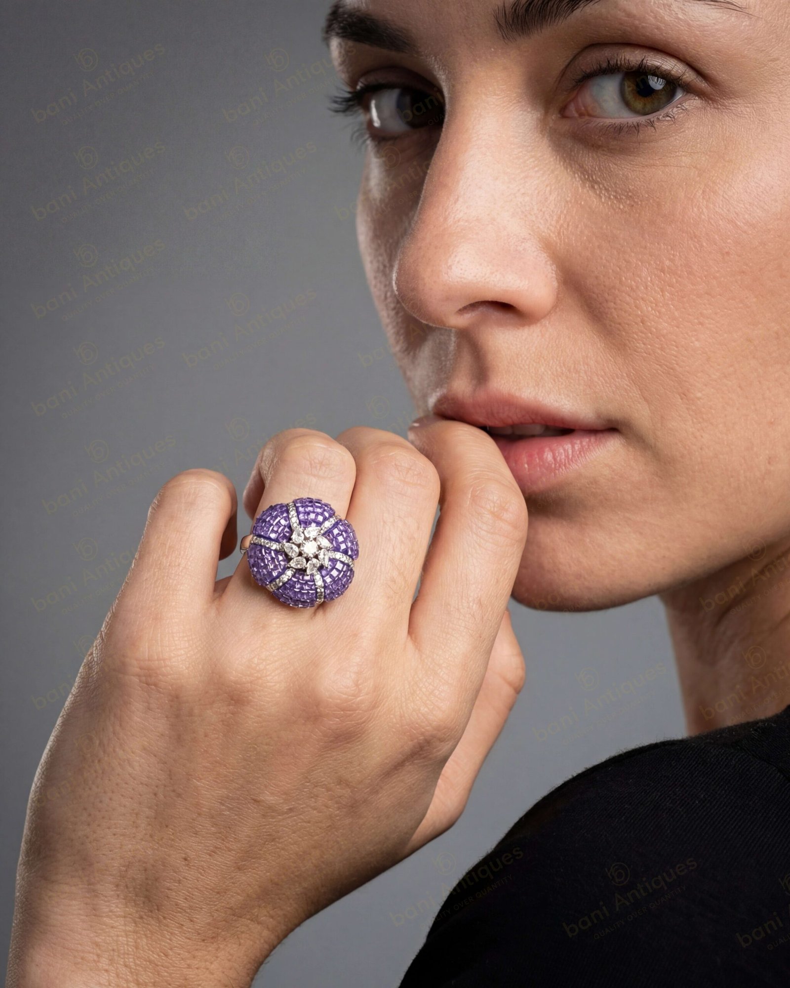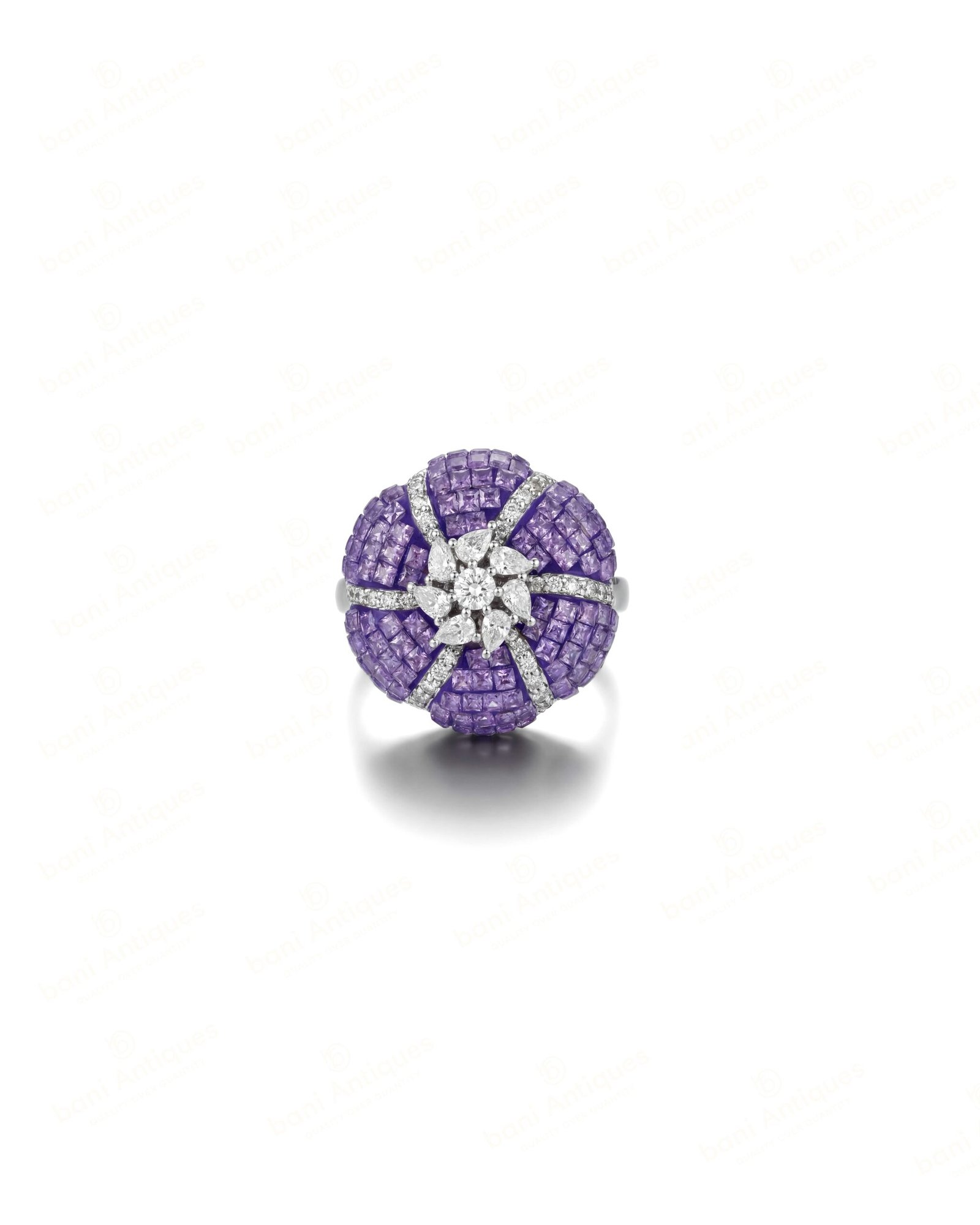 Dome cocktail ring in brass with 18k white gold plating, featuring a floral motif centered with your choice of gemstone—ruby, sapphire, emerald, or amethyst. With its sculpted dome silhouette and vibrant jewel tones, this bold statement piece is designed for women who love standout style.