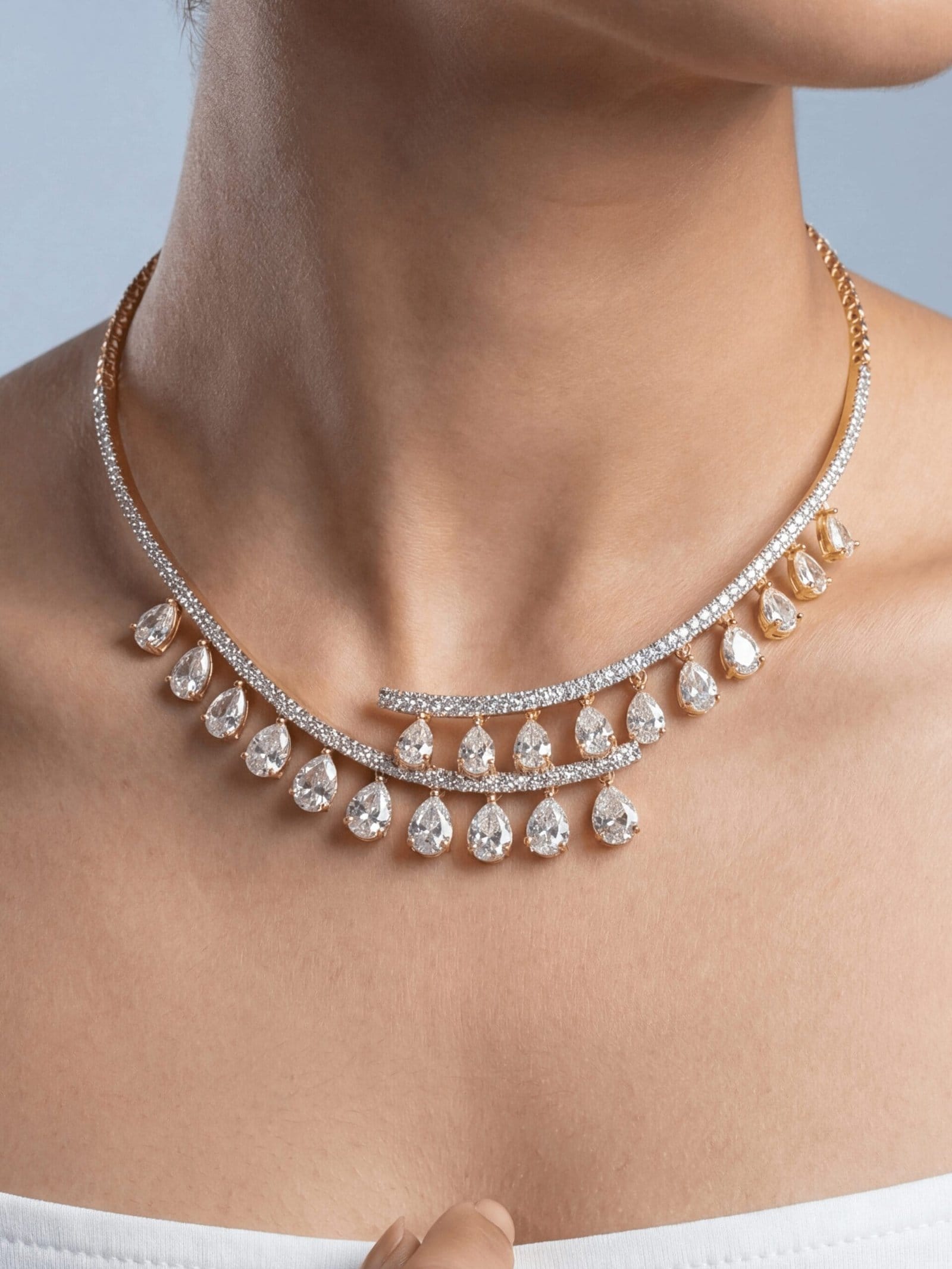 A contemporary classic designed to elevate every celebration, the Dual Symphony Pear Choker Set blends a sleek dual-layer silhouette with cascading pear-cut brilliance. Available in both Royal Emerald Green and Classic Crystal Diamond, this versatile choker frames the neckline with luminous drops that sway gently with every movement—perfect for brides, bridesmaids, festive occasions, and luxury evening wear.