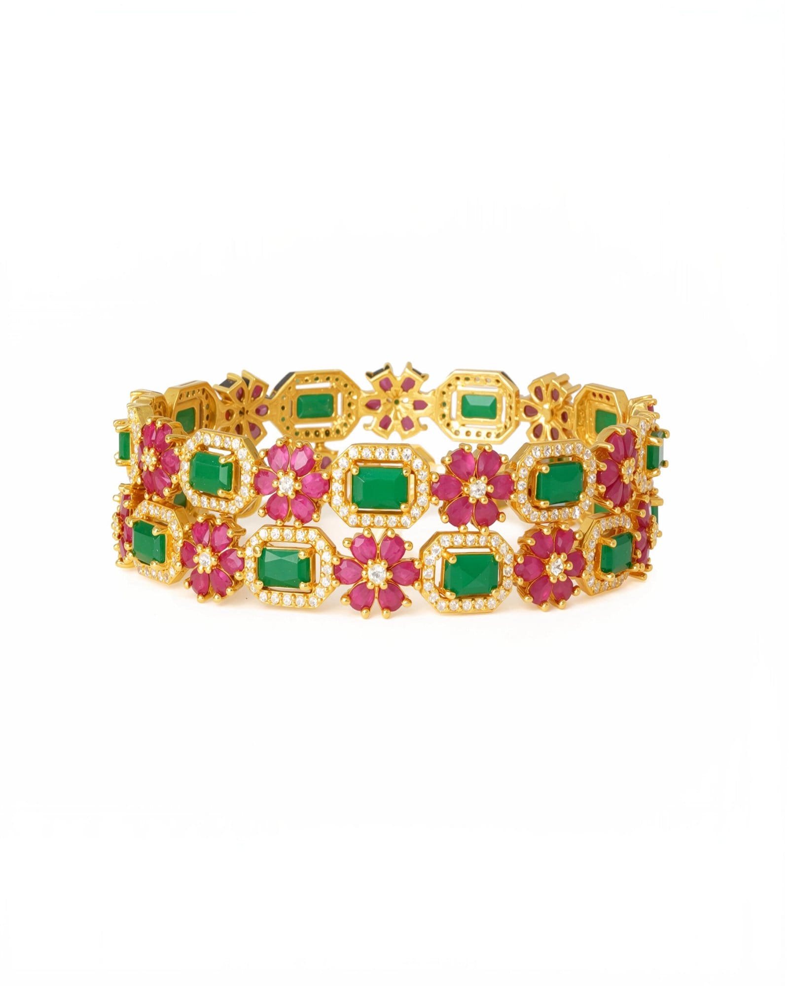 The Emerald Blossom Heritage Bangles embody timeless grandeur with vibrant emerald-cut stones surrounded by radiant ruby floral clusters. Each bangle is a masterpiece of traditional artistry and modern elegance, making it a perfect choice for weddings, festive celebrations, and regal soirées.