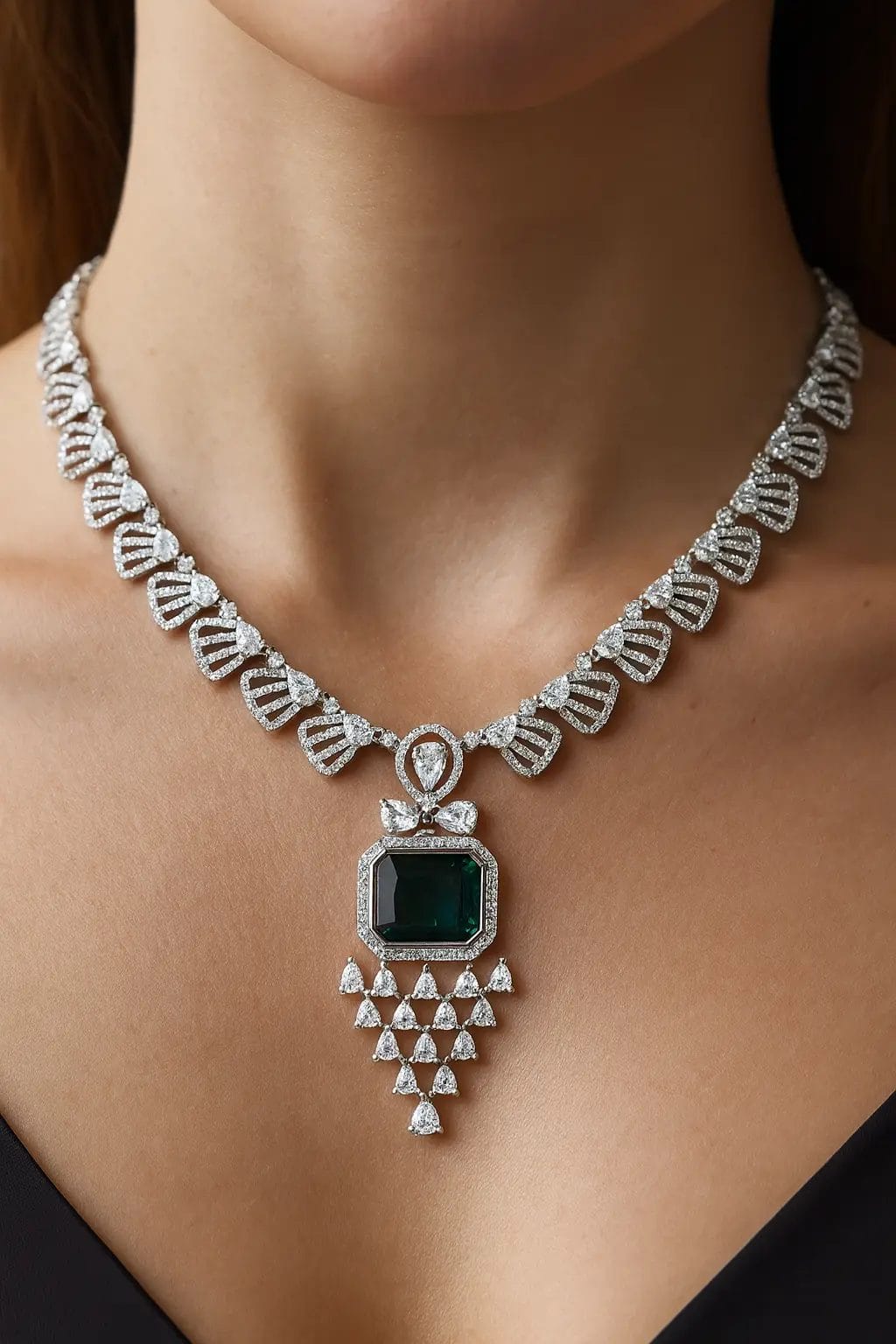 Bold and regal, this necklace set showcases a vibrant emerald-cut green stone framed with brilliant American diamonds. The cascading drop design adds drama and elegance, while the princess length (34–42 cm) allows it to sit gracefully on the neckline. Crafted on a brass base with rhodium plating, this striking necklace is paired with long 8 cm earrings for a complete statement look — perfect for weddings, receptions, and grand celebrations.