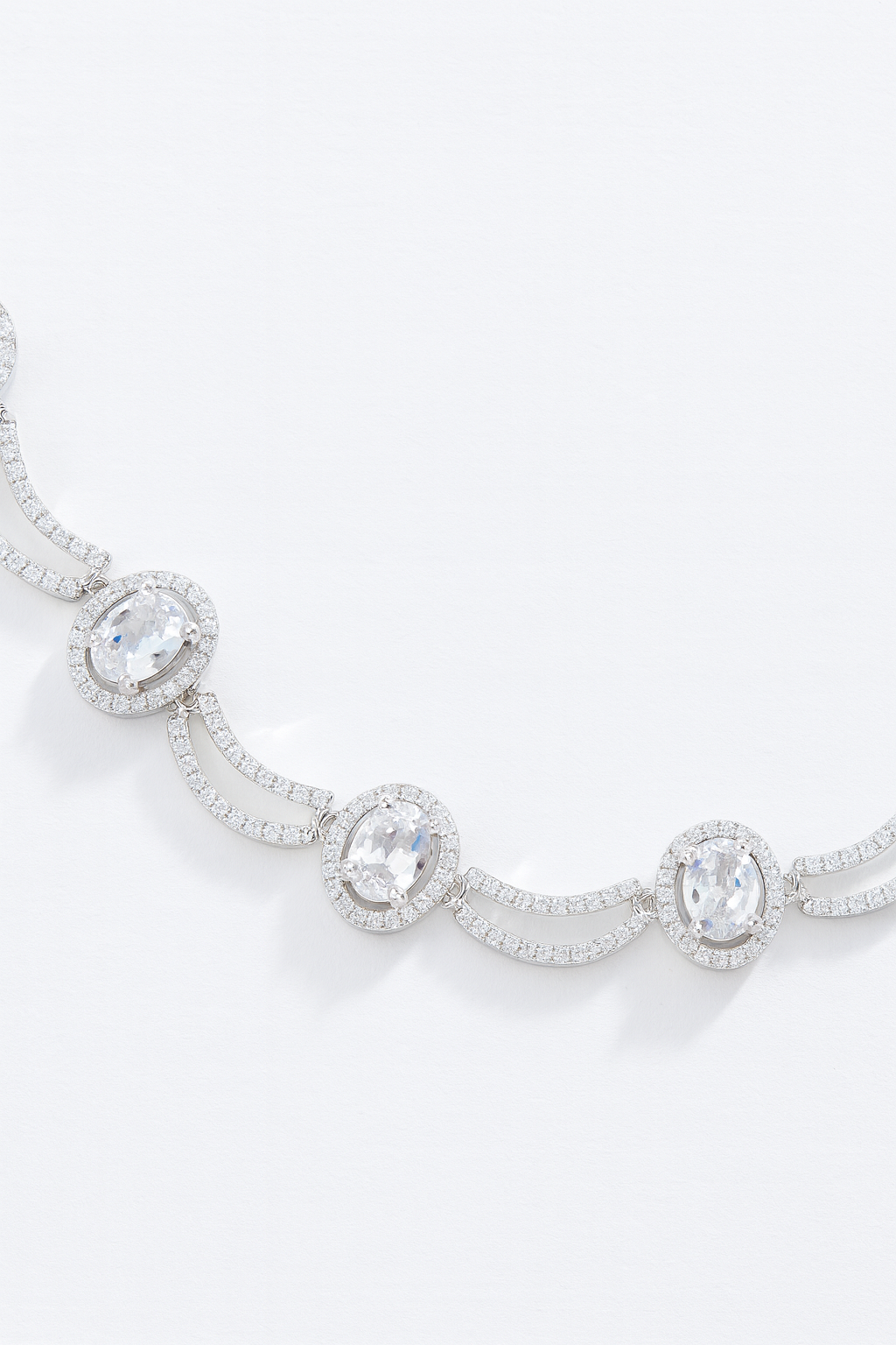 A refined necklace set featuring oval-cut white stones encircled by shimmering American diamonds. The double-curve links add elegance and flow, creating a modern yet timeless design. Sitting at princess length (38–42 cm), the necklace pairs beautifully with matching 4.5 cm earrings, making it a versatile set for weddings, receptions, and evening occasions. Crafted on a brass base with rhodium plating, it blends luxury with lasting shine.