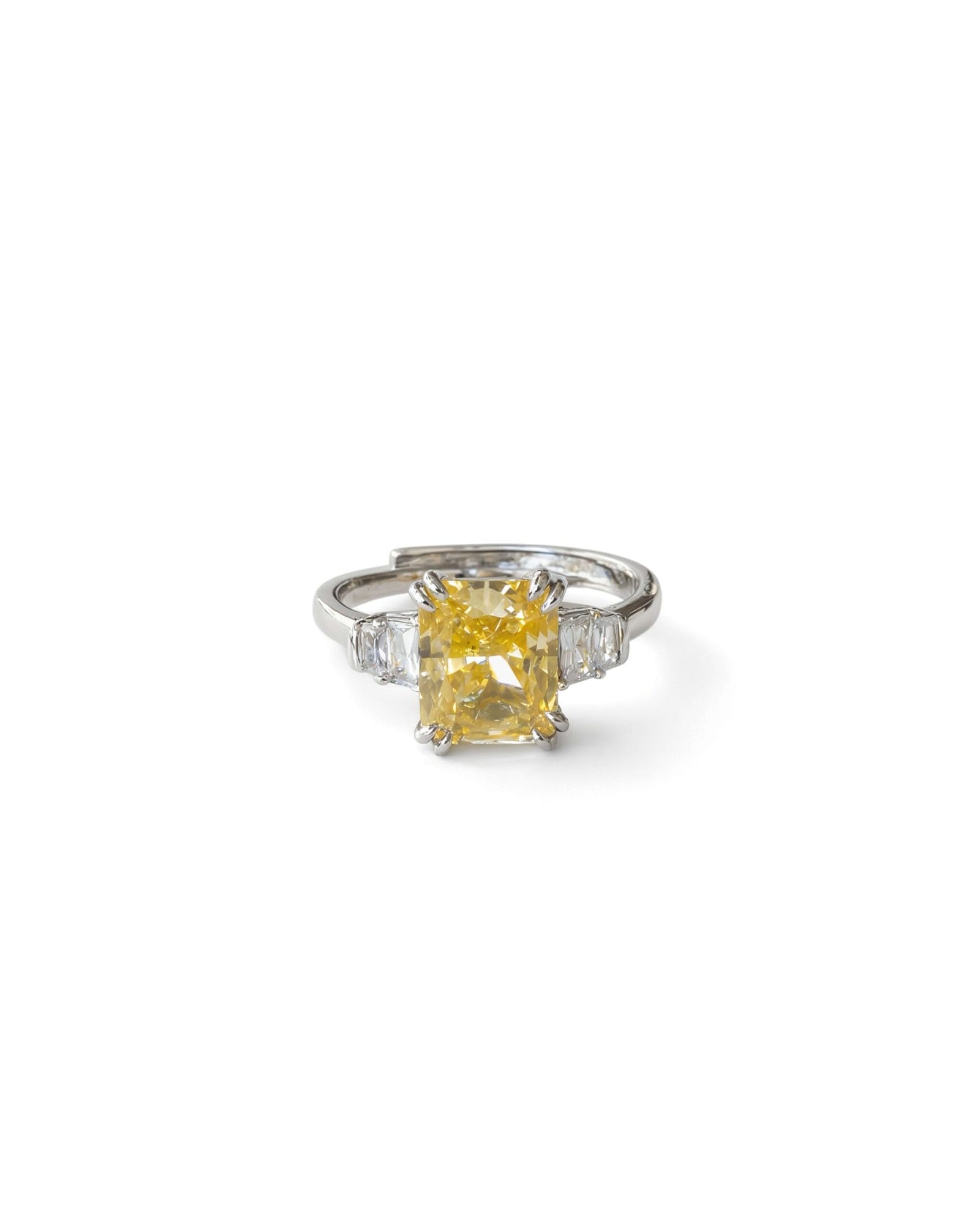 - Center Stone: Radiant-Cut Yellow Gemstone