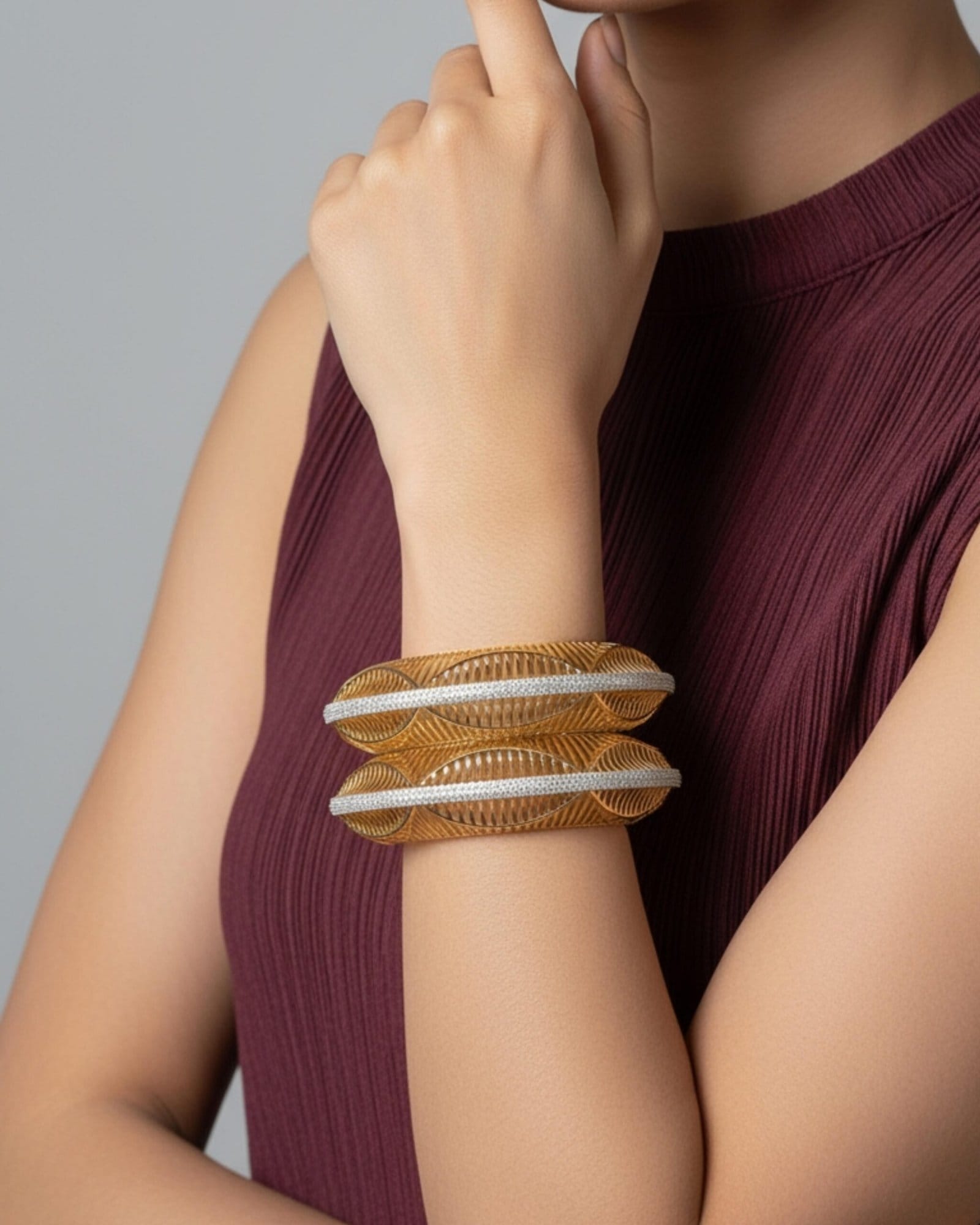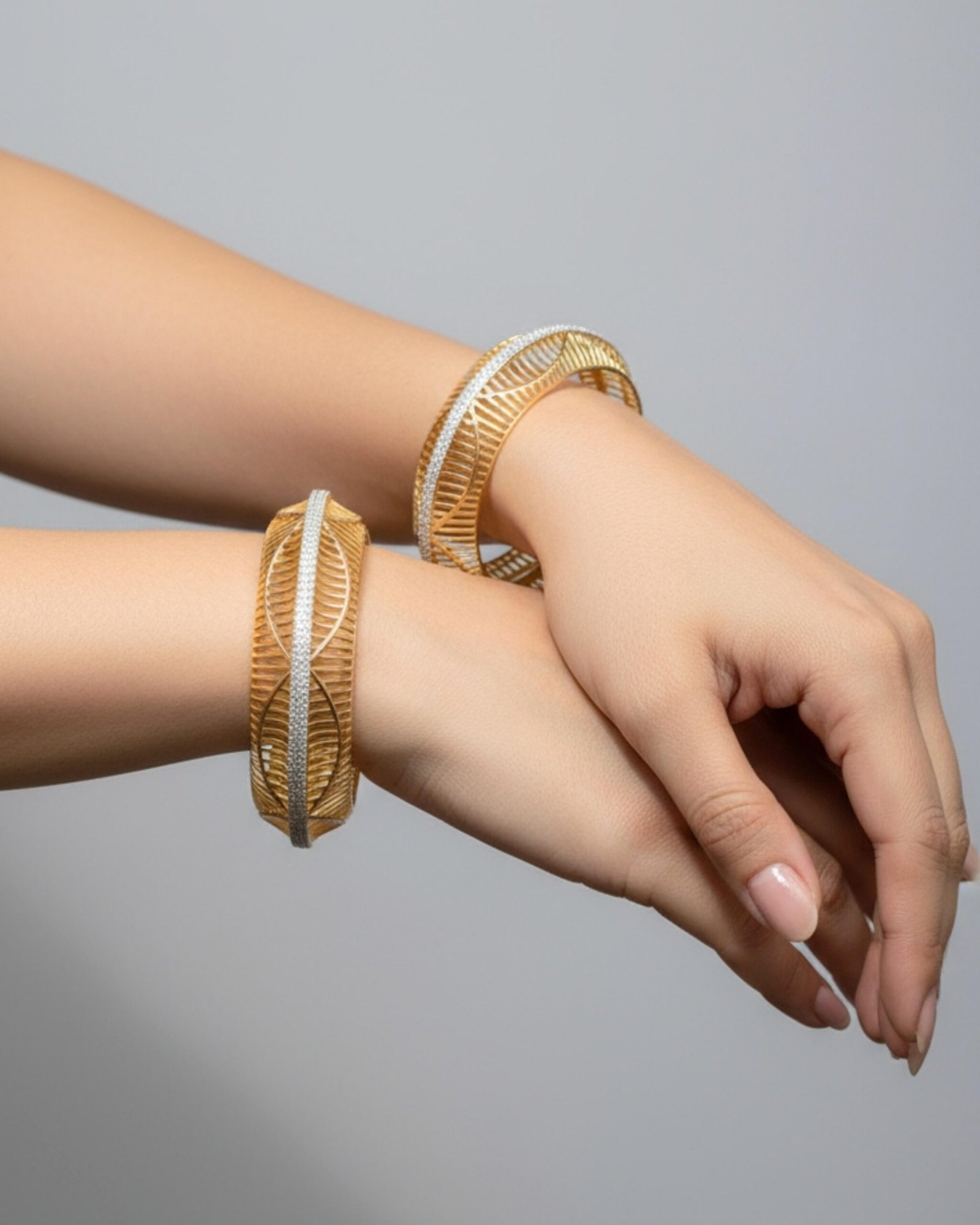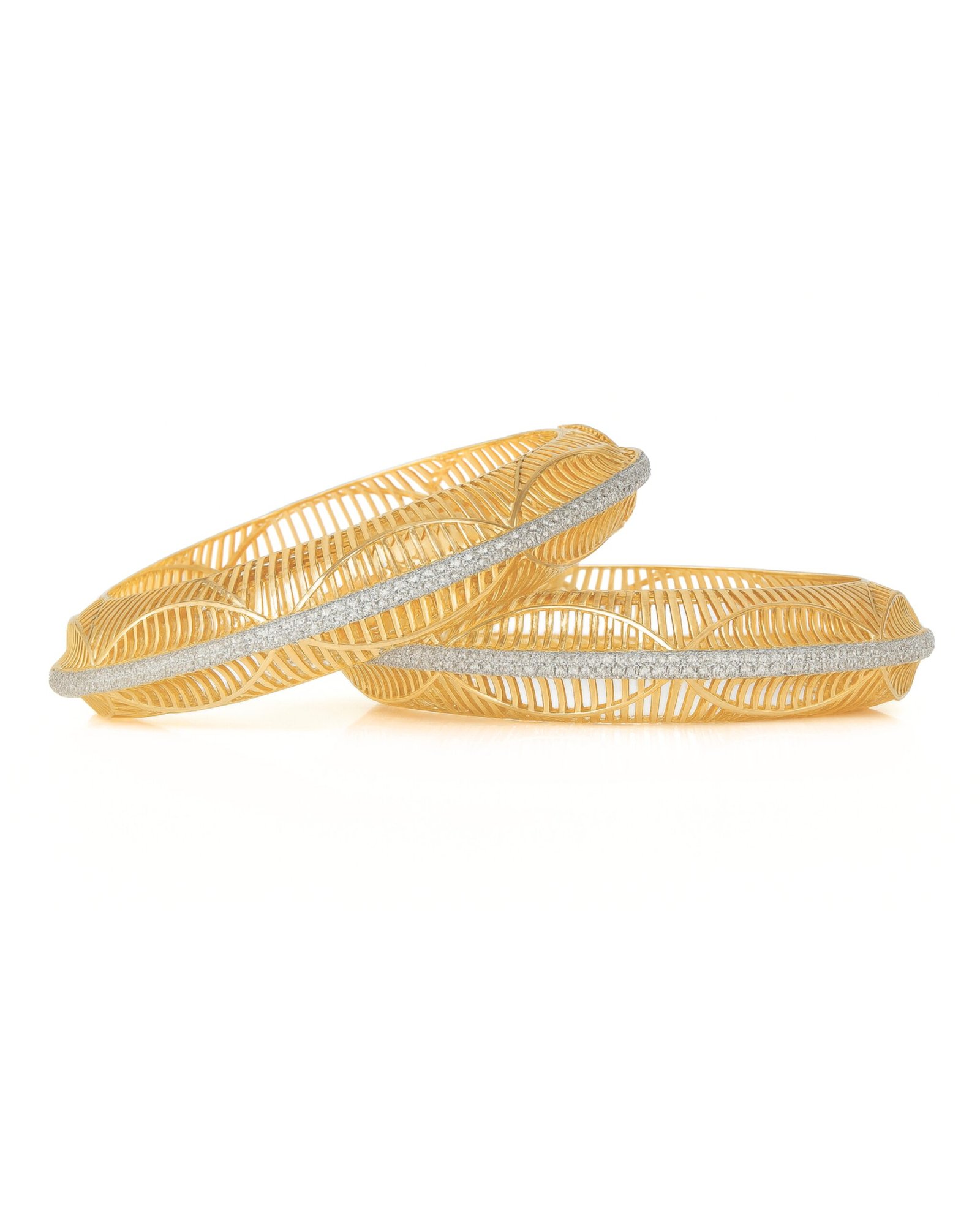 A masterpiece of lightness and luxury, the Feather Aura Diamond Lattice Bangles feature an intricate feather-inspired filigree silhouette, beautifully accentuated with rows of pavé-set diamonds. Their fluid, airy design and sculptural curves offer a sophisticated statement, perfect for modern brides or elegant evening wear