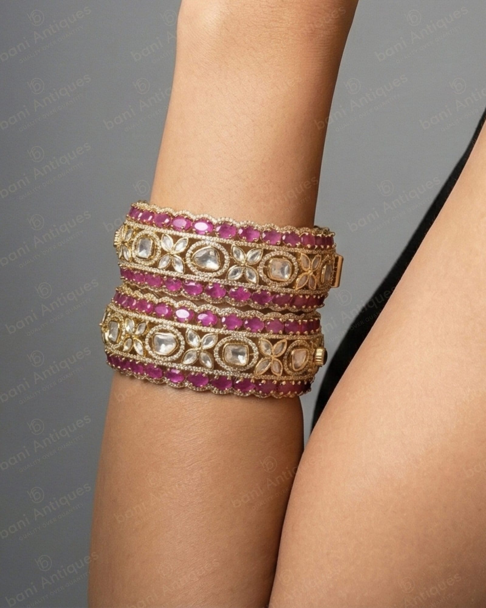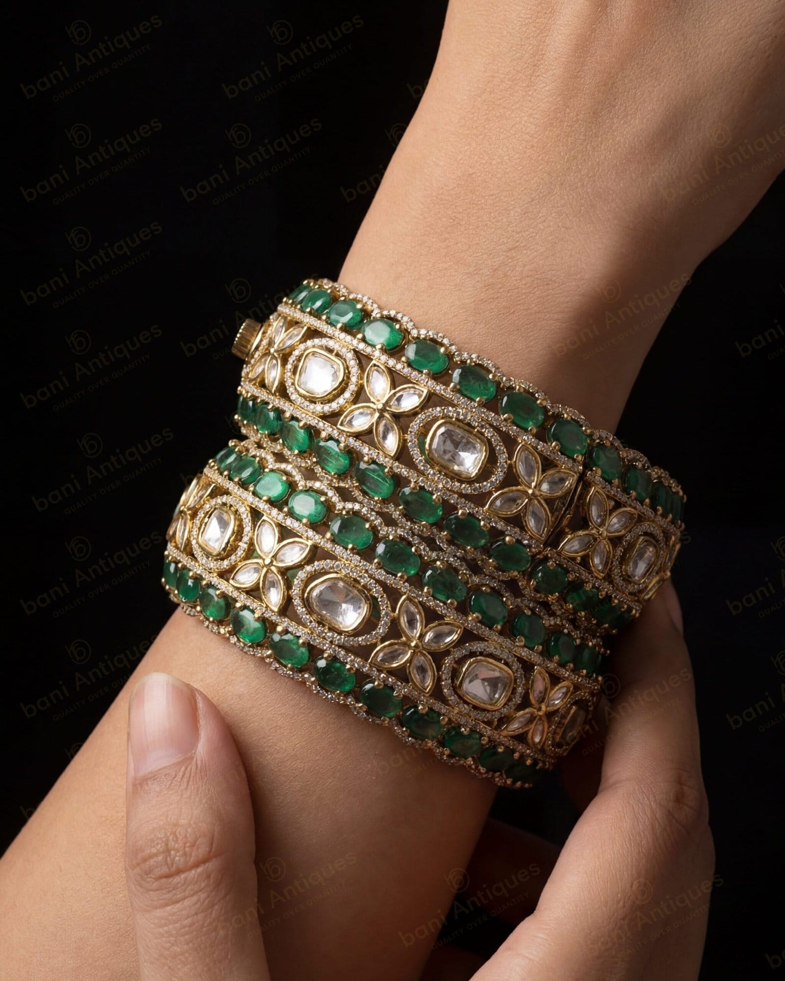 - Design Details: Wide traditional statement bangles featuring floral quatrefoil motifs, bezel-set clear stones, and multi-row gemstone borders