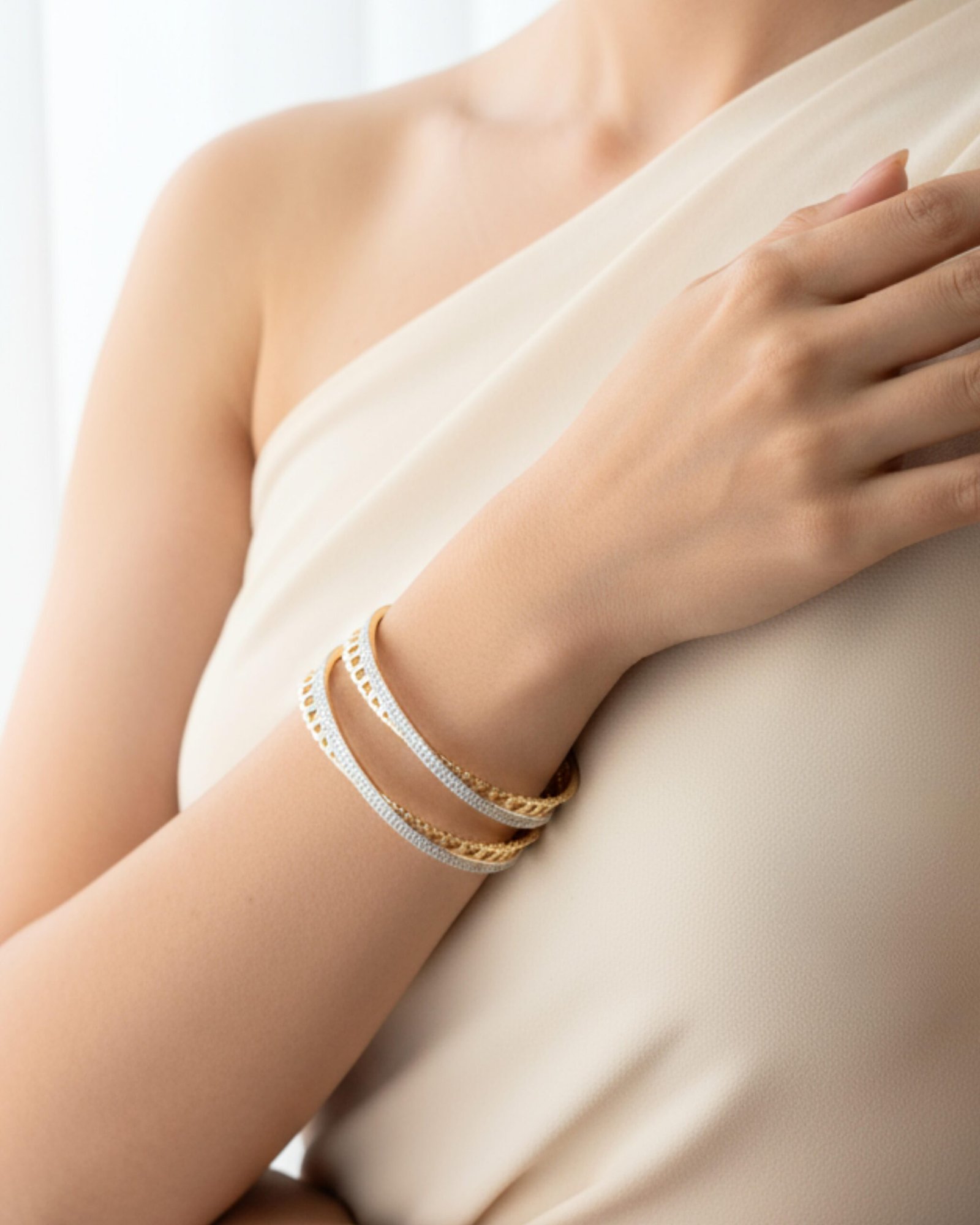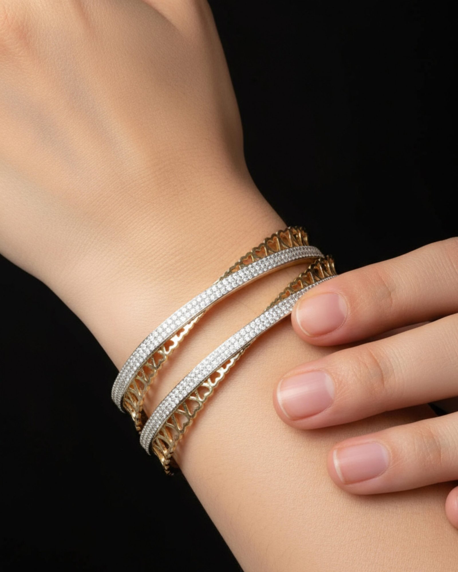 Delicate yet dazzling, the Heartlace Pavé Crossover Bangles feature slim pavé bands that glide over a scalloped heart-cut gallery. Their feather-light feel and romantic detailing make them perfect for stacking or wearing solo for refined sparkle.