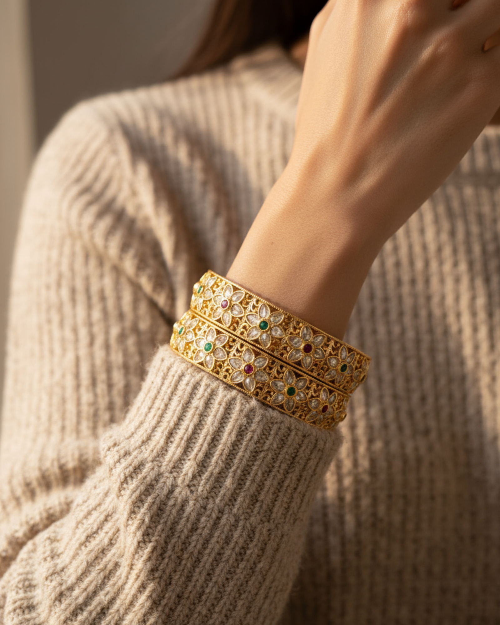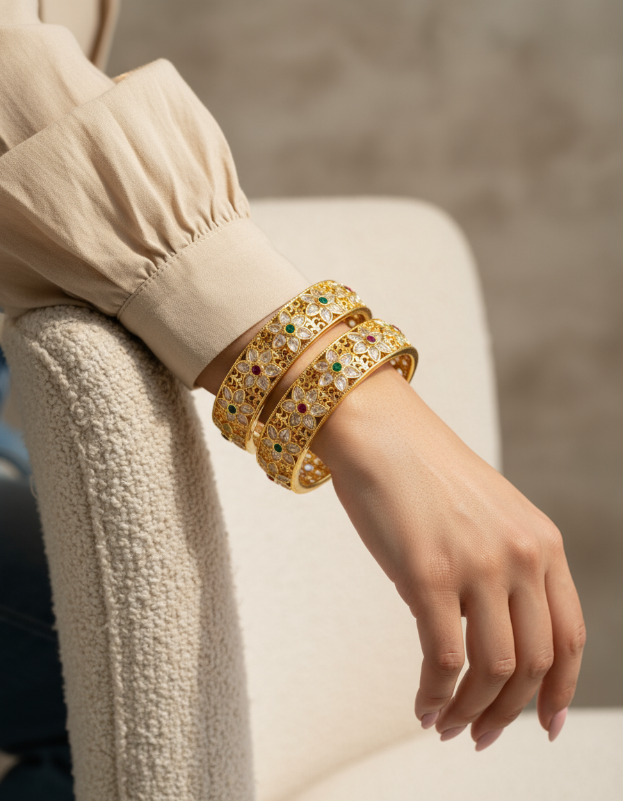 The Kundan Floral Heritage Bangles bring timeless tradition and elegance together with their exquisite floral motifs crafted from tear-drop CZ stones and accented with ruby and emerald centers. The intricate openwork detailing and regal gold finish make these bangles a statement piece for weddings, festive celebrations, and heirloom collections.