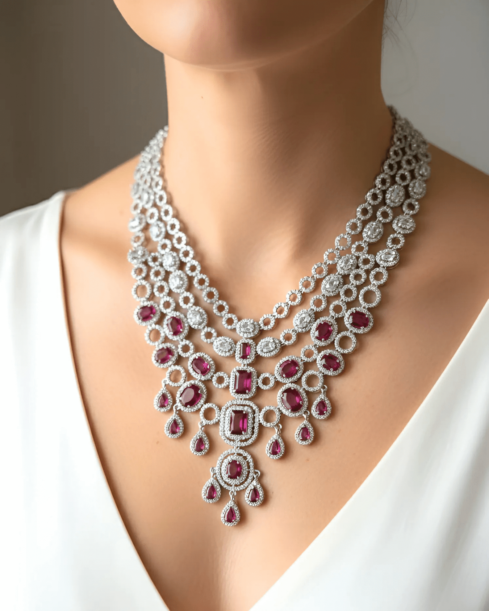 A grand, trousseau-worthy statement: triple graduated rows of pavé halos dotted with oval and emerald-cut ruby crystals, sweeping into pear-drop cascades. Finished with a matching chandelier maang tikka for full royal drama.