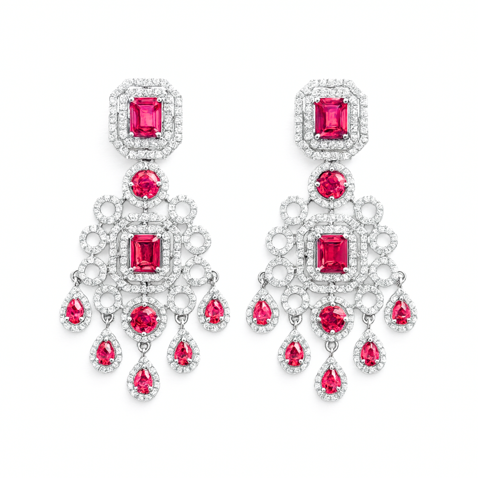 Design Notes: Multi-row halo setting, step-cut center rubies, and cascading pear-drop charms; high-shine pavé for bridal sparkle