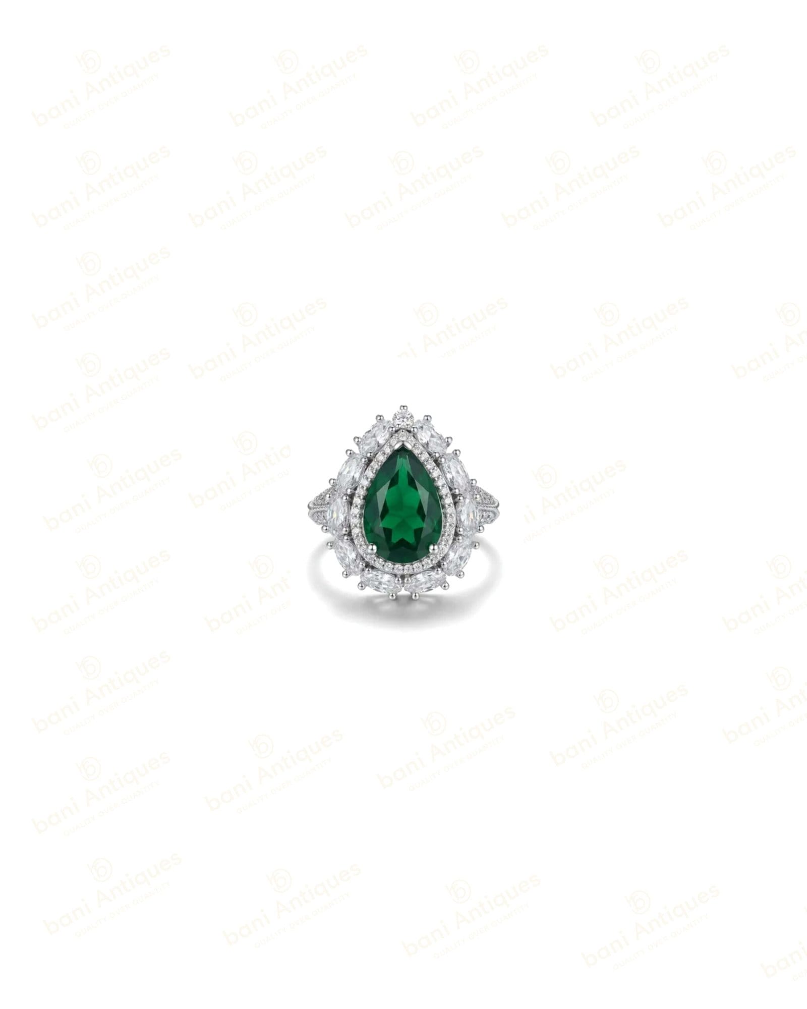 Halo ring in brass with 18k white gold plating, featuring a teardrop-shaped green center gemstone surrounded by round white stones on the halo and band. With its elegant pear-shaped design and full pavé accents, this piece offers timeless sophistication for women.