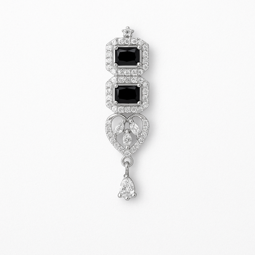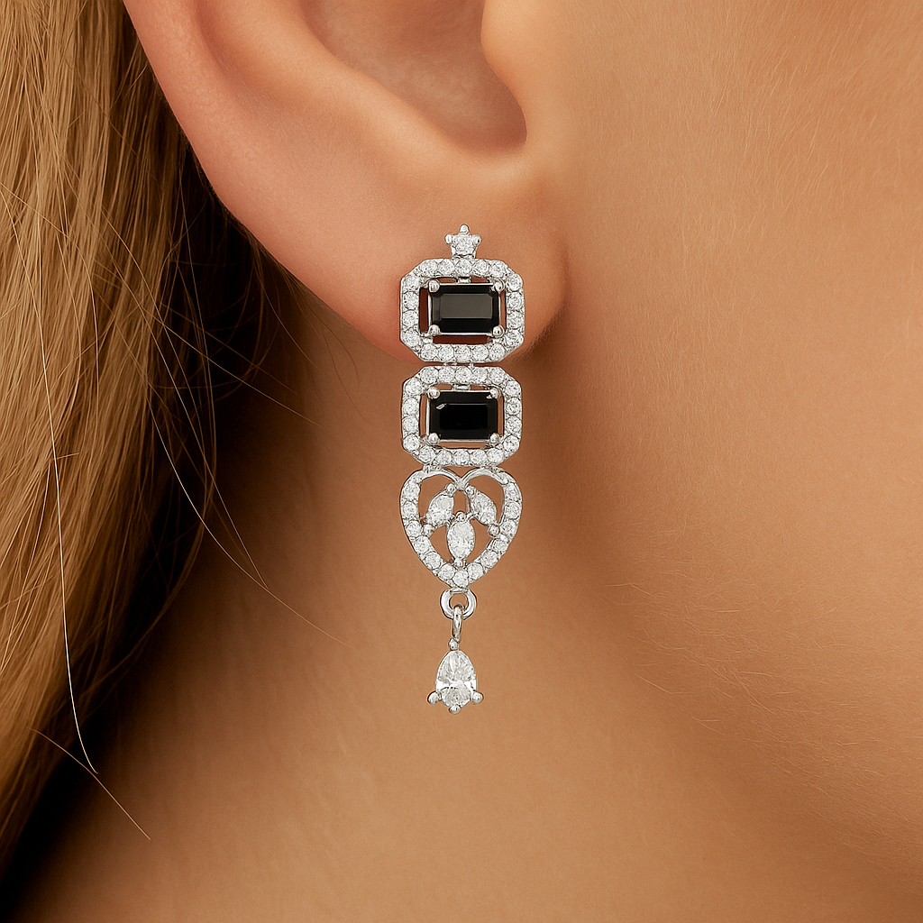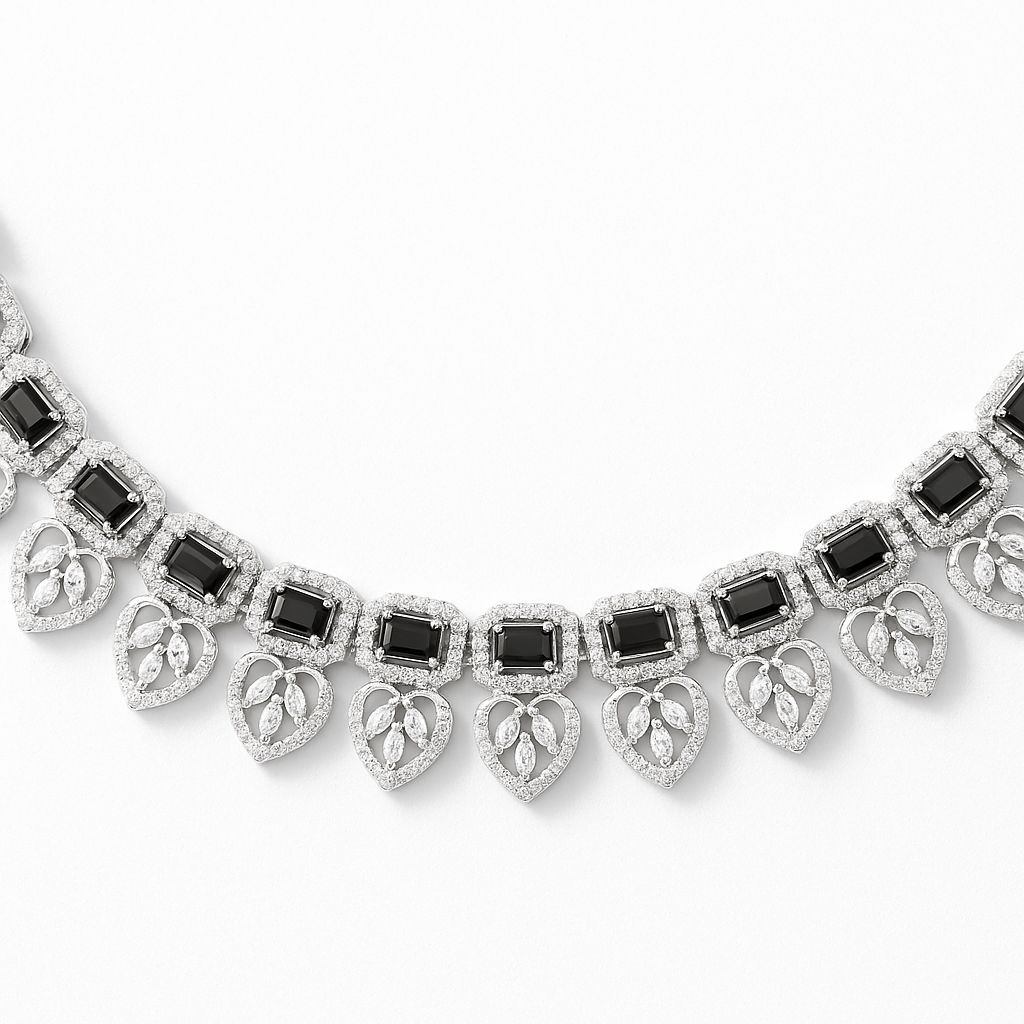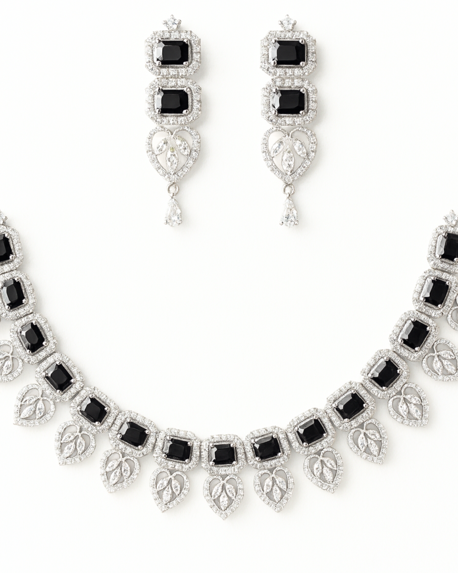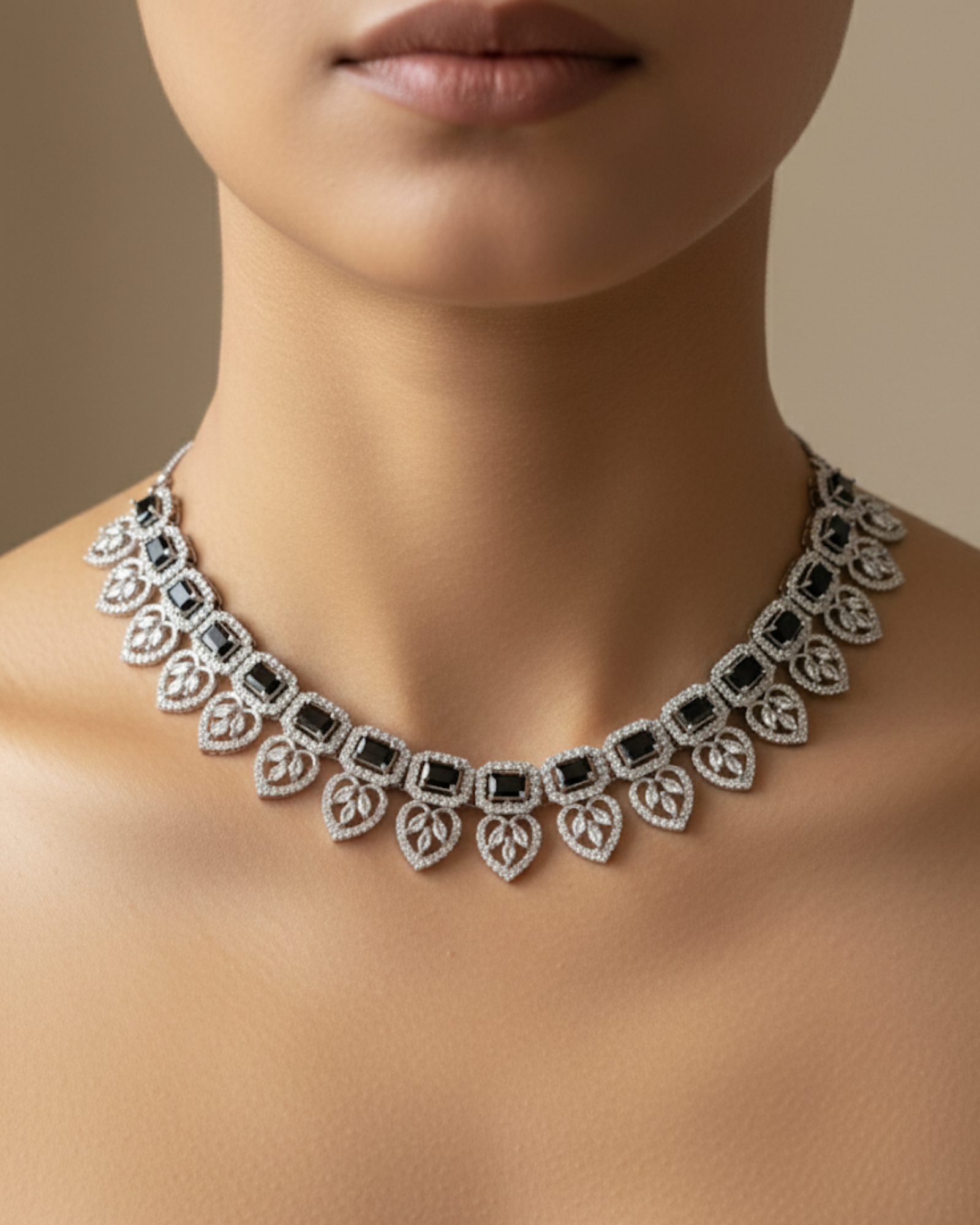 An exquisite necklace adorned with deep black stones framed in sparkling halos and leaf-inspired diamond accents. The matching drop earrings complete the refined look, making this set a versatile choice for evening soirées or formal celebrations.
