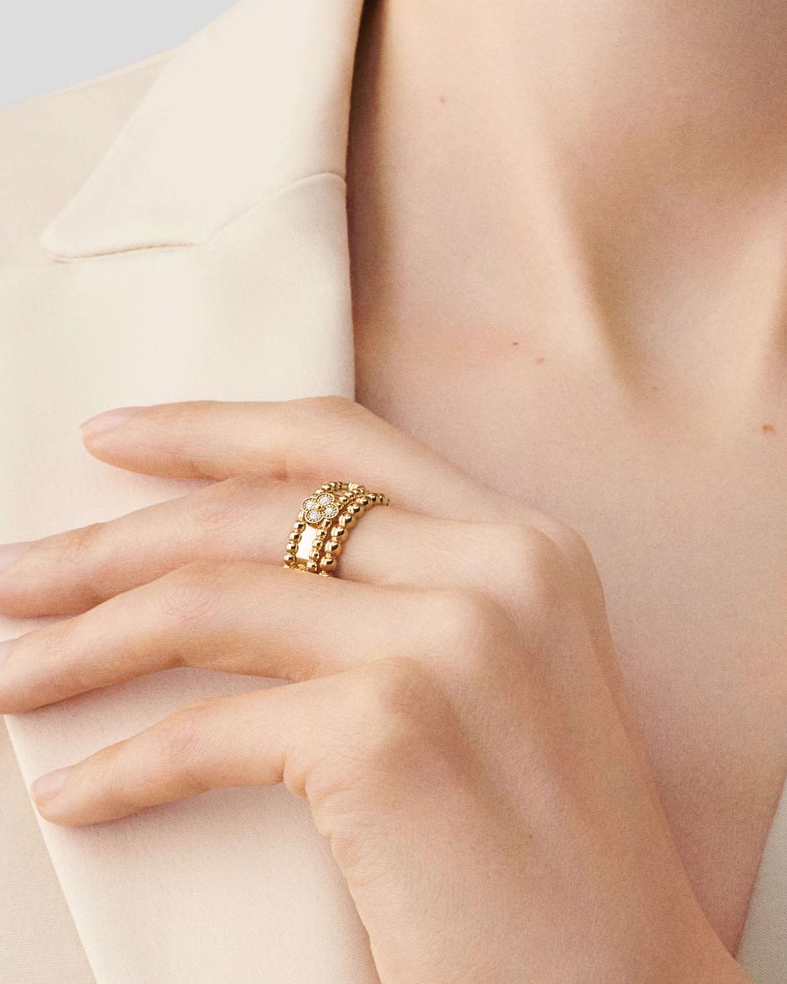 Perlée Sweet Clovers ring in real 18k thick gold plating (not electroplated), accented with round diamonds. A premium women’s ring offering authentic color, luster, and weight, presented in its original box and backed by a one-year color-retention warranty.