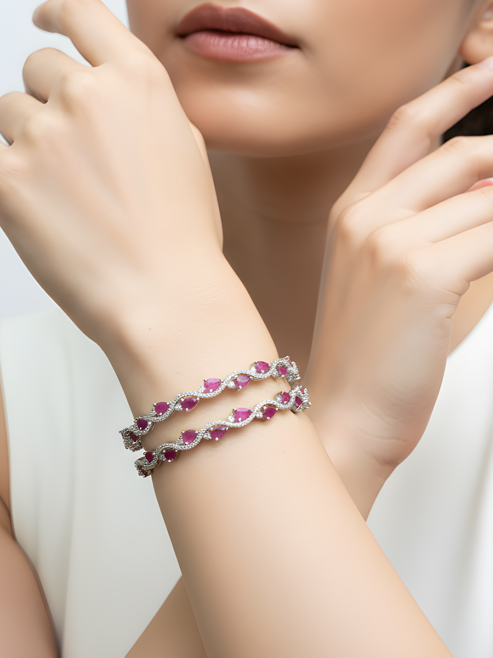 Delicate and graceful, the Pink Wave Bangles feature a flowing intertwined design set with pear-shaped pink stones, enhanced by sparkling CZ diamonds. Their rhythmic pattern exudes timeless elegance, making them a versatile choice for both modern and traditional ensembles.