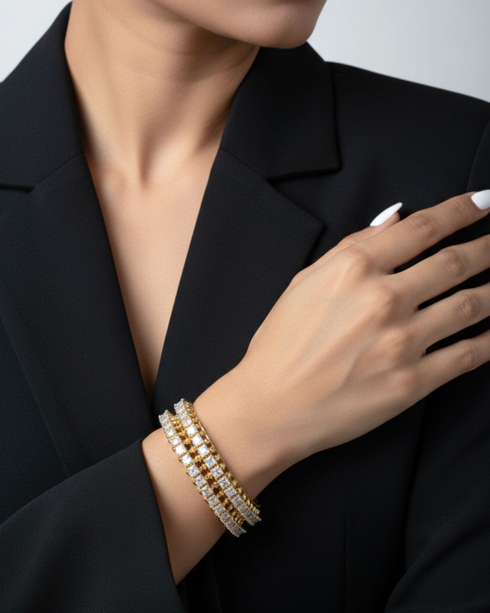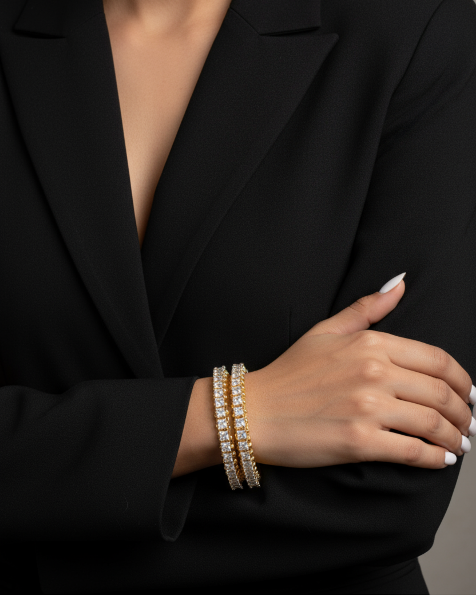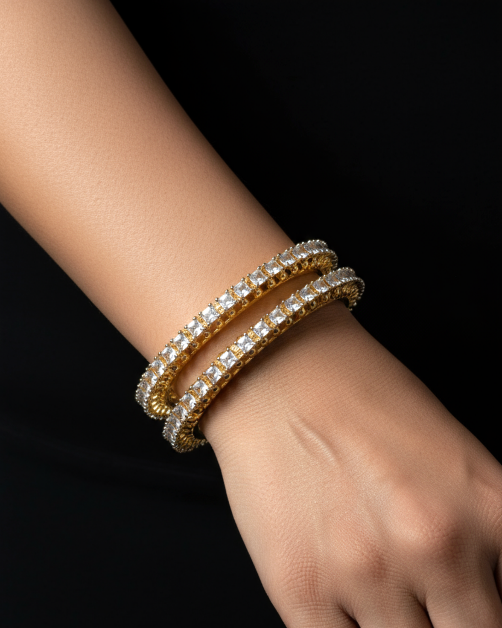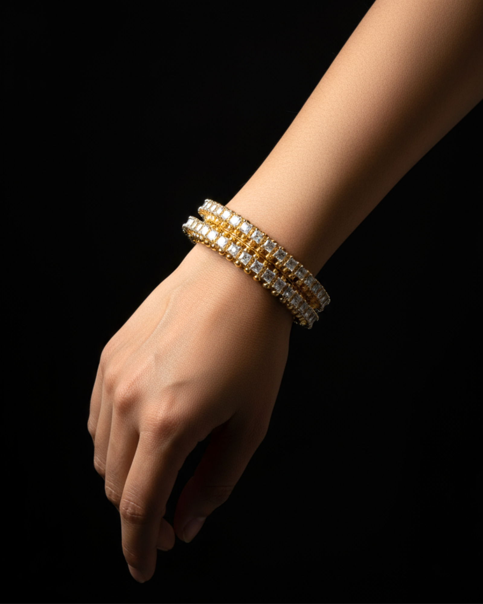 A sleek symphony of sparkle, the Princess-Cut Tennis Edge Bangles showcase continuous rows of square stones framed by beaded edges and a refined two-tone finish. Elegant, modern, and endlessly wearable for weddings or festive soirées.