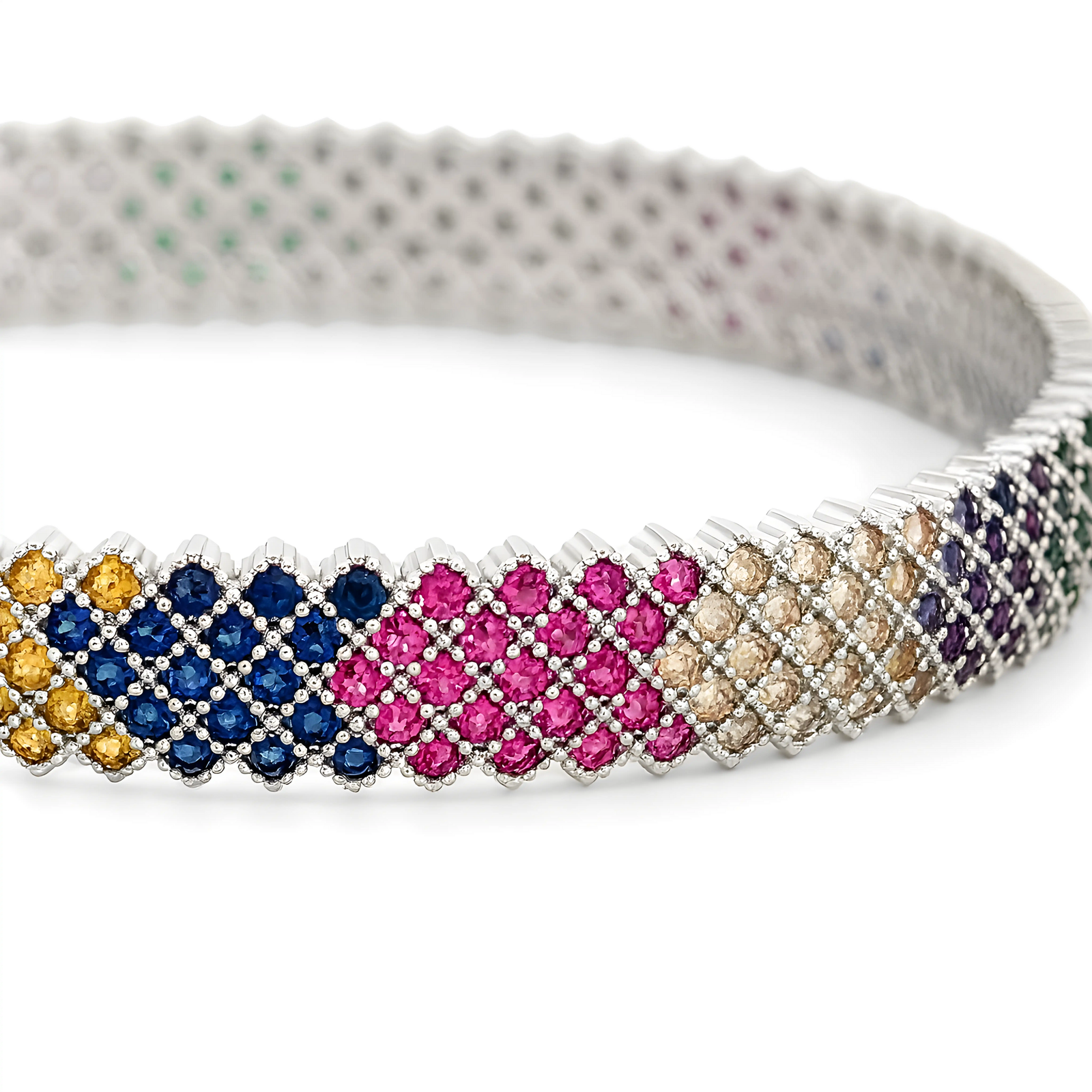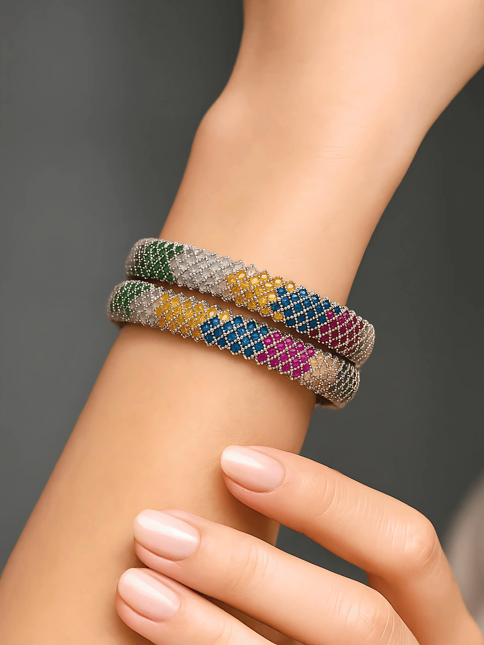 A joyful burst of color—multicolor CZs are pavé-set in an intricate rhodium lattice, creating a chic, wear-with-everything duo.