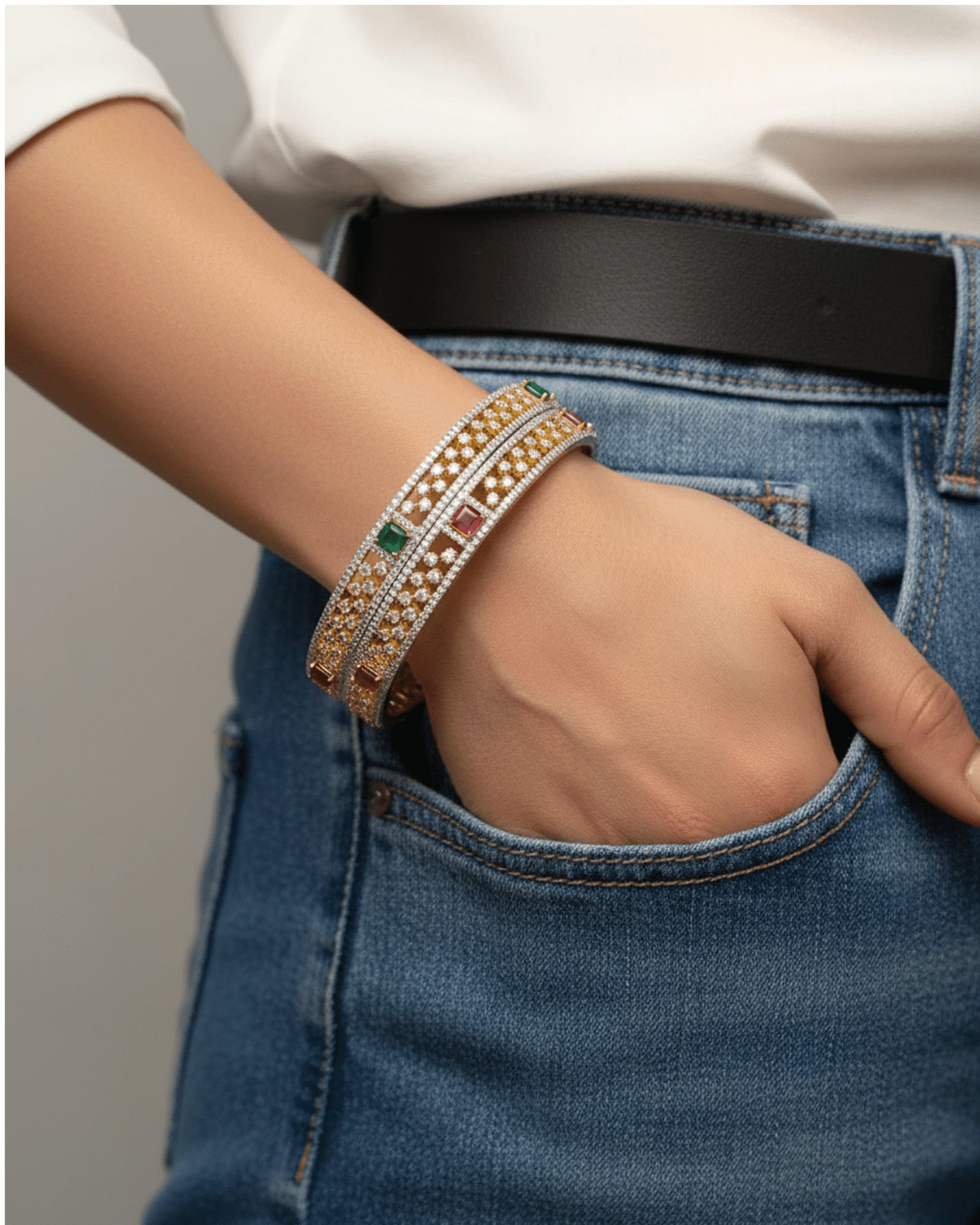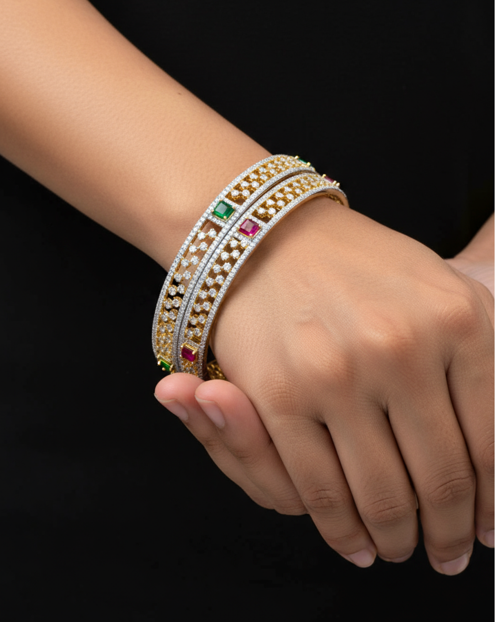 The Regal Emerald Ruby Moissanite Bangles beautifully combine vibrant gemstones with exquisite detailing, featuring vivid green emeralds and rich rubies set amidst sparkling moissanite. Their sleek, refined design makes them perfect for both grand celebrations and elegant soirées, offering timeless sophistication with a contemporary twist.
