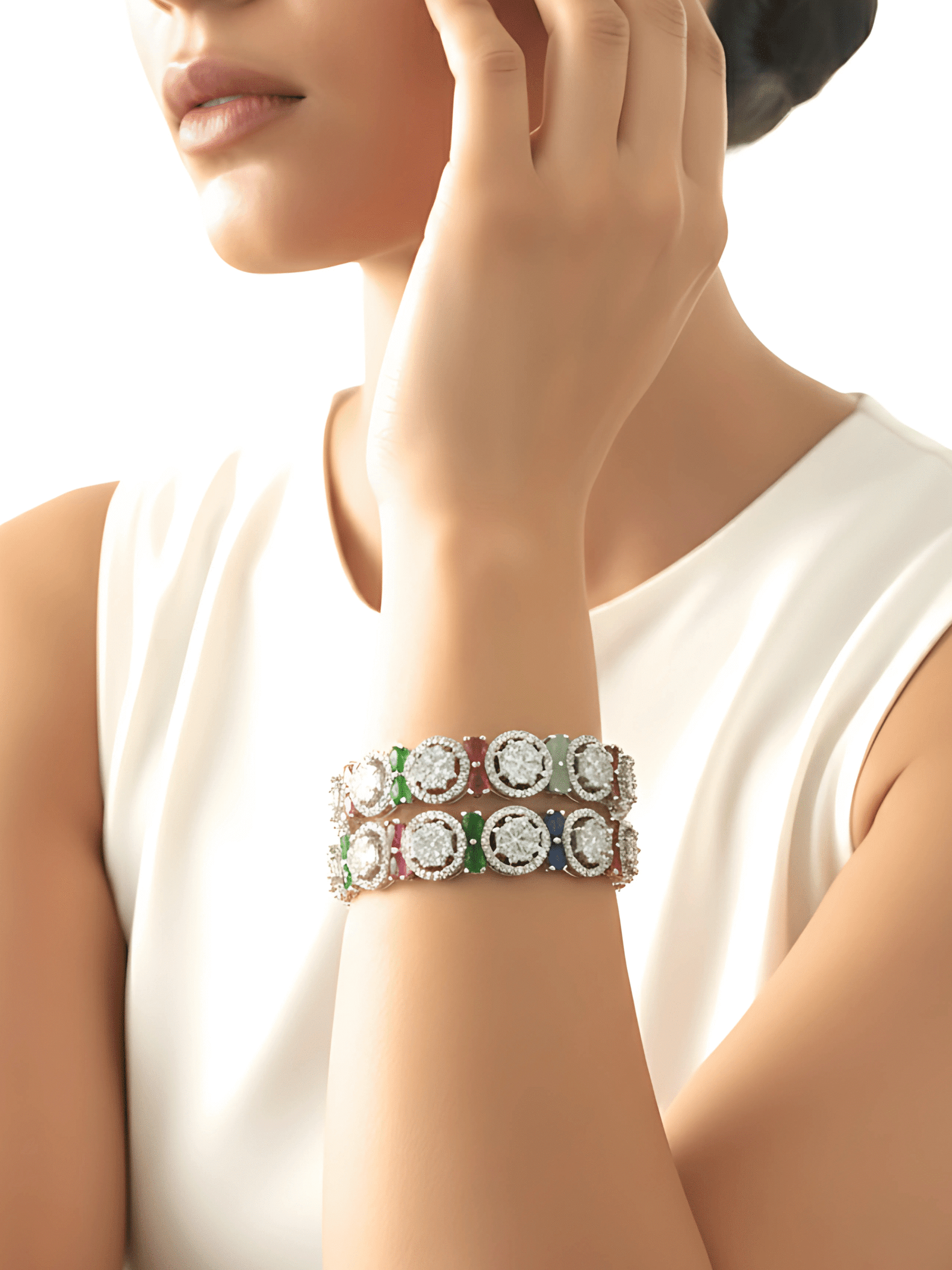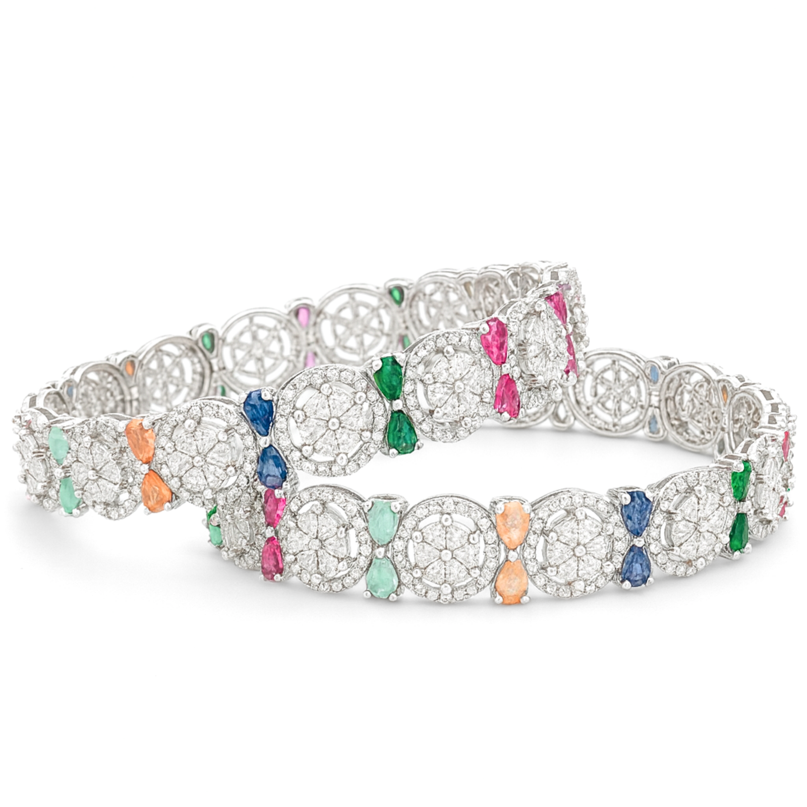 These exquisite bangles are a blend of sparkle and vibrant hues. Adorned with dazzling circular CZ clusters framed by colorful gemstones in sapphire blue, emerald green, ruby pink, and aqua tones, this design balances elegance with playfulness. The fine detailing makes them perfect for both festive occasions and sophisticated evening wear.