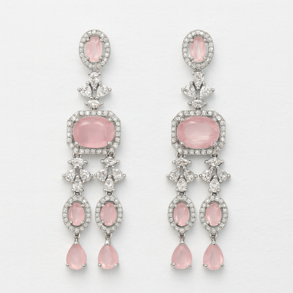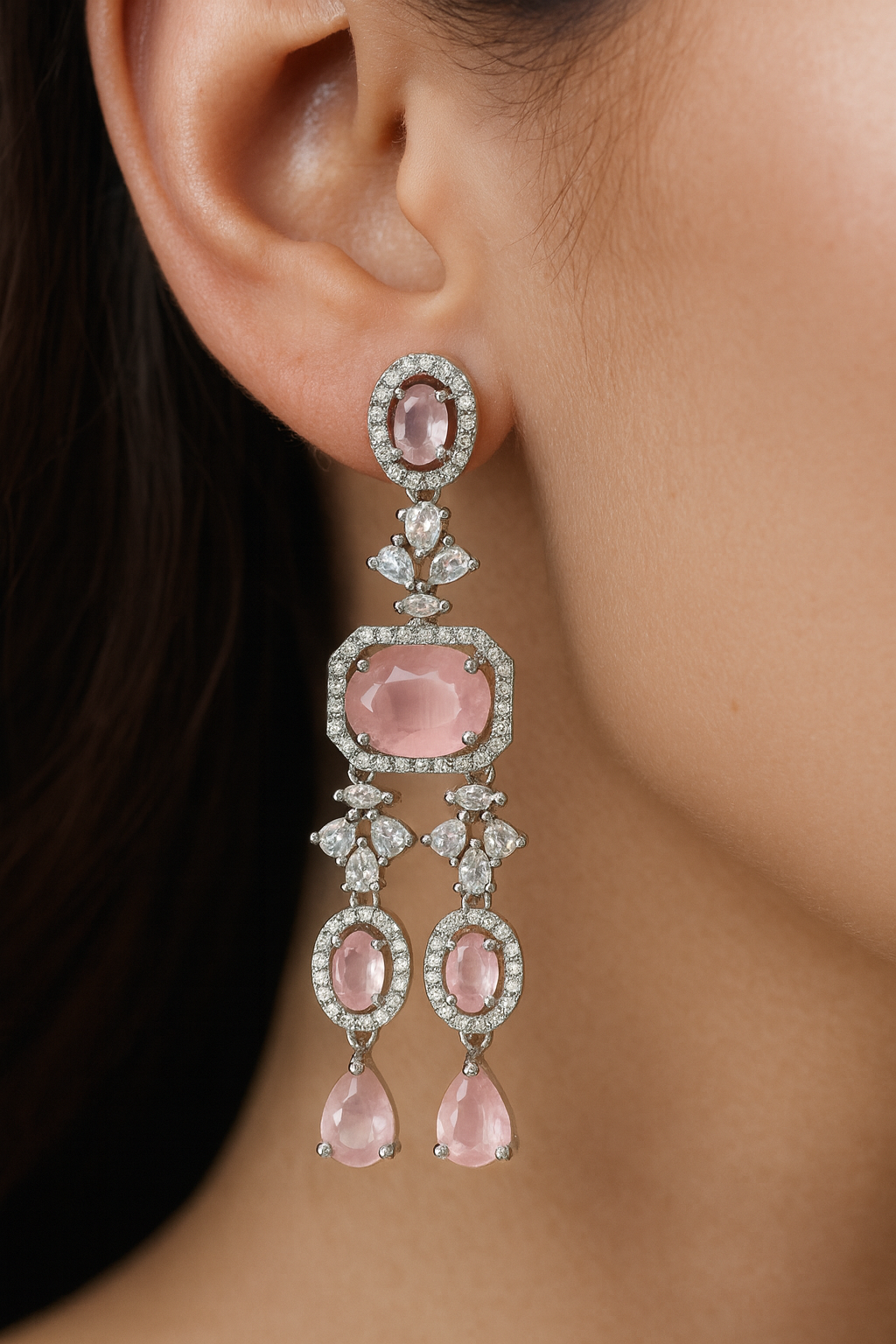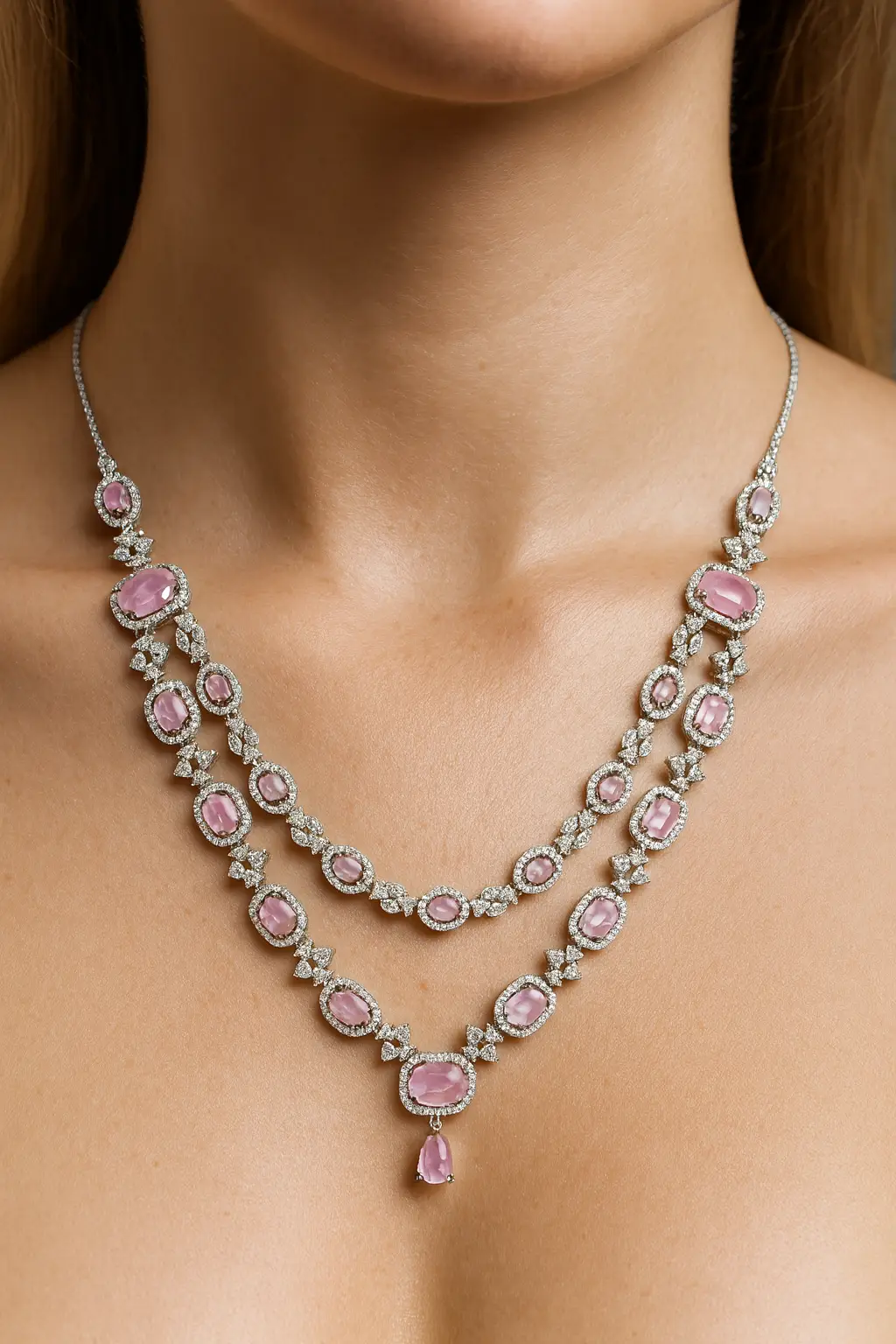 A statement necklace set designed for elegance and grandeur. Featuring soft blush pink stones surrounded by sparkling American diamonds, the double-layer design adds depth and sophistication, while the teardrop pendant creates a graceful finish. Crafted on a brass base with rhodium plating, this princess-length set (42–48 cm) comes with matching long earrings for a complete look — perfect for weddings, receptions, and luxury occasions.