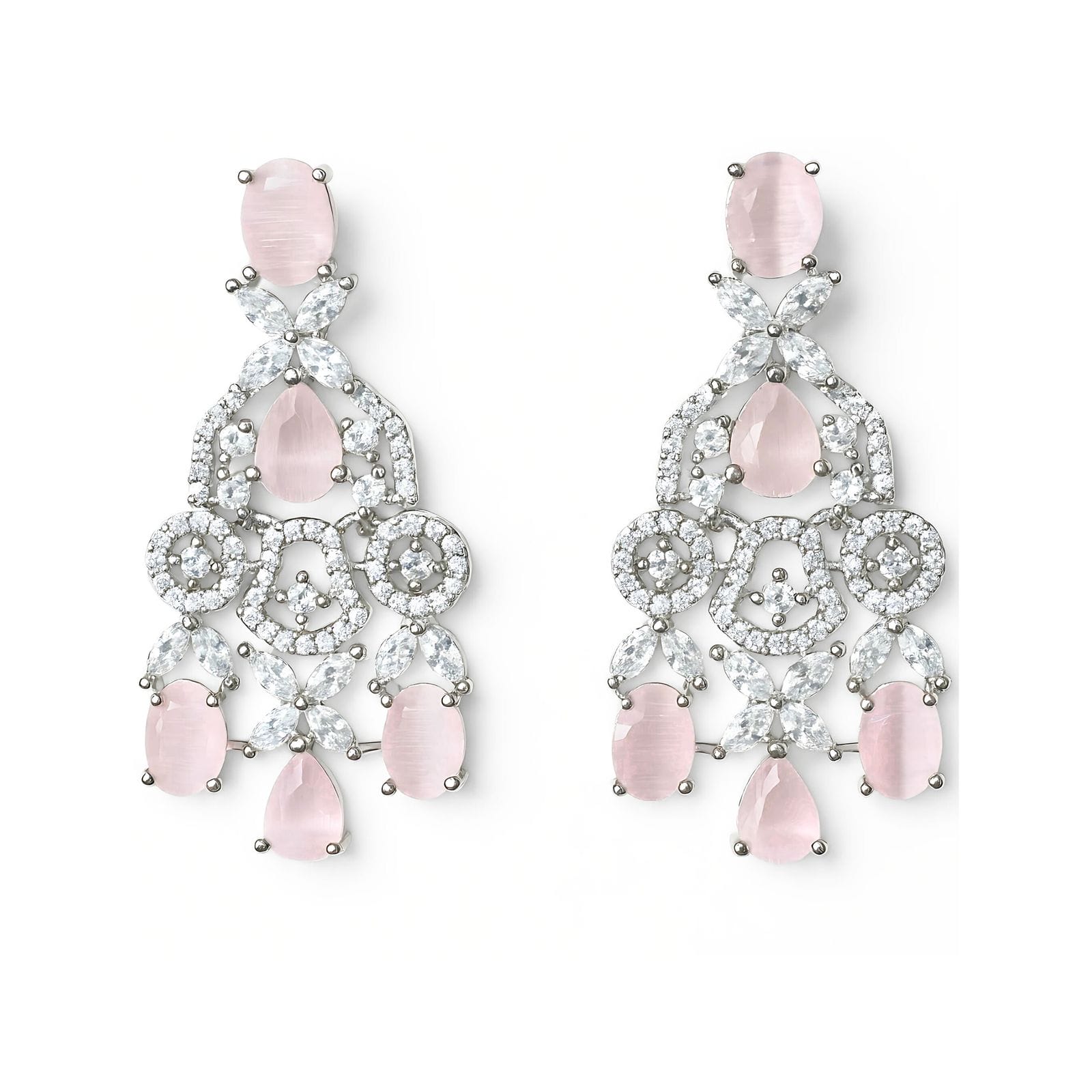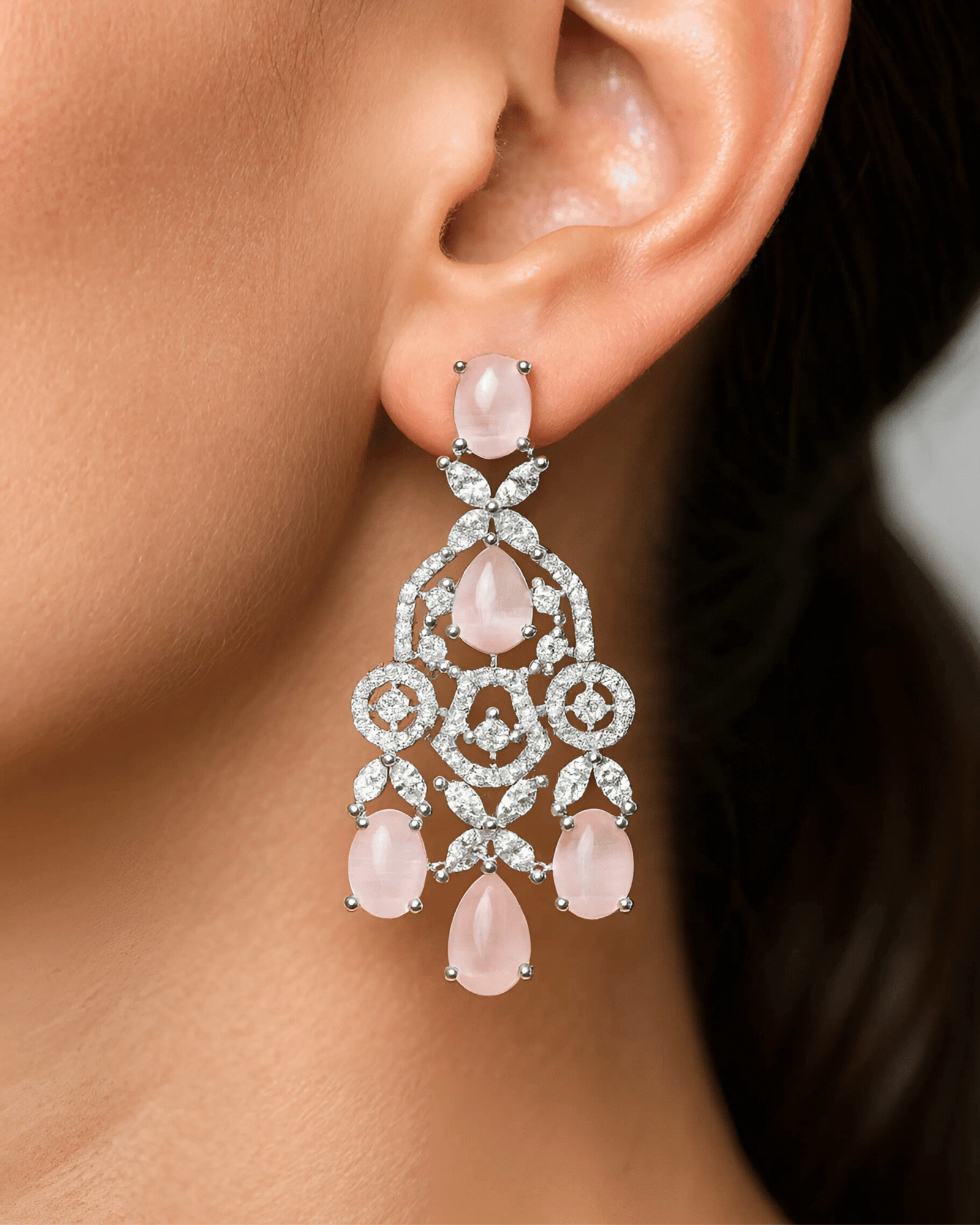 Soft and romantic in pastel pink. This set highlights oval rose quartz drops paired with sparkling floral motifs and pavé-set circles—an elegant choice for special occasions.