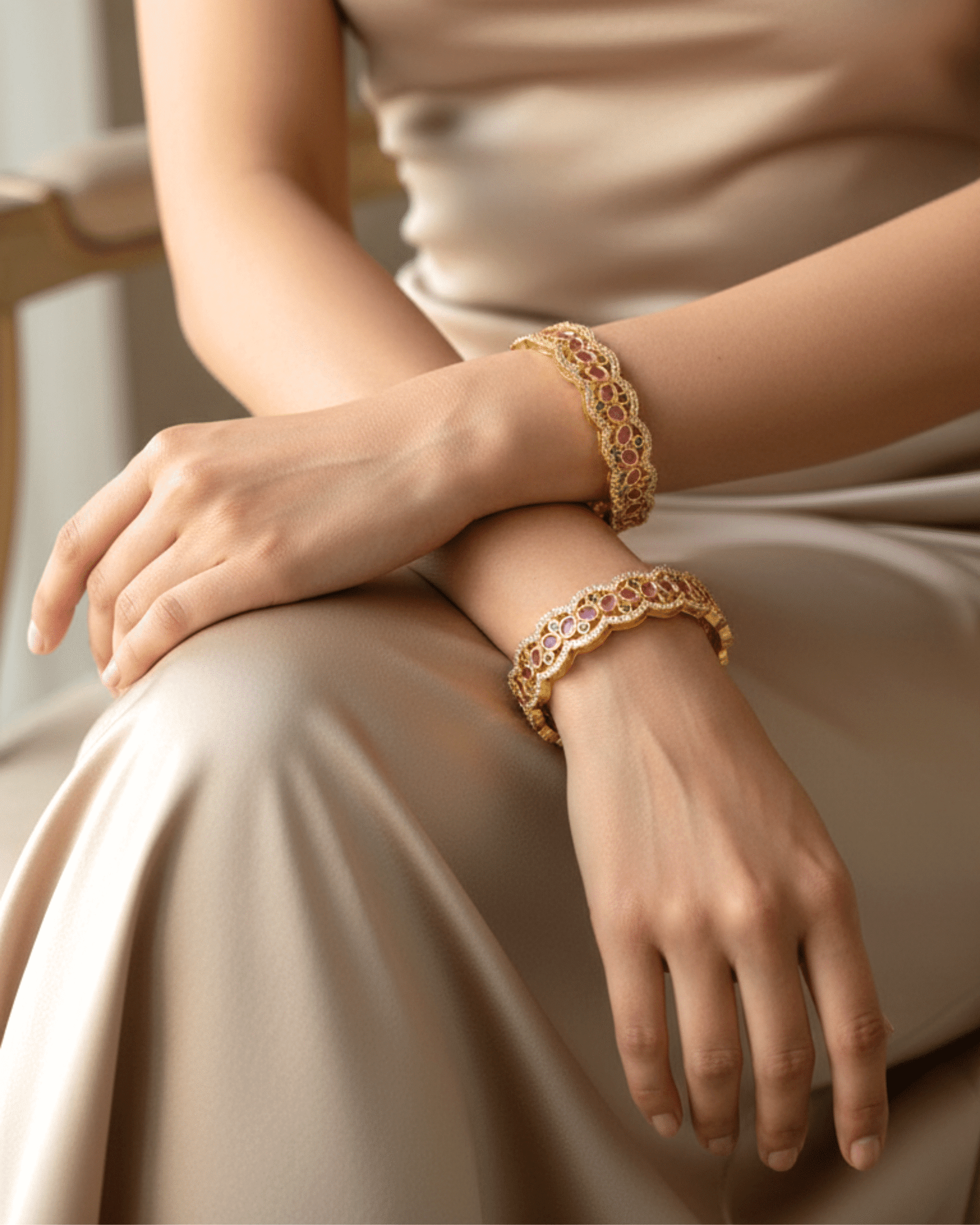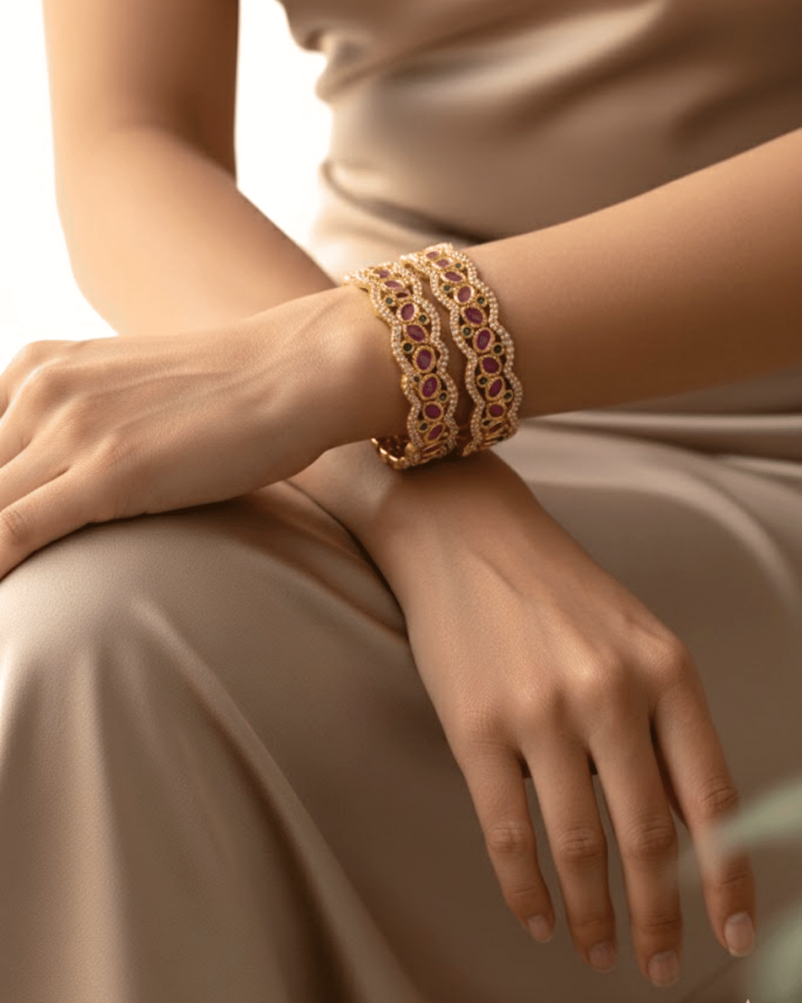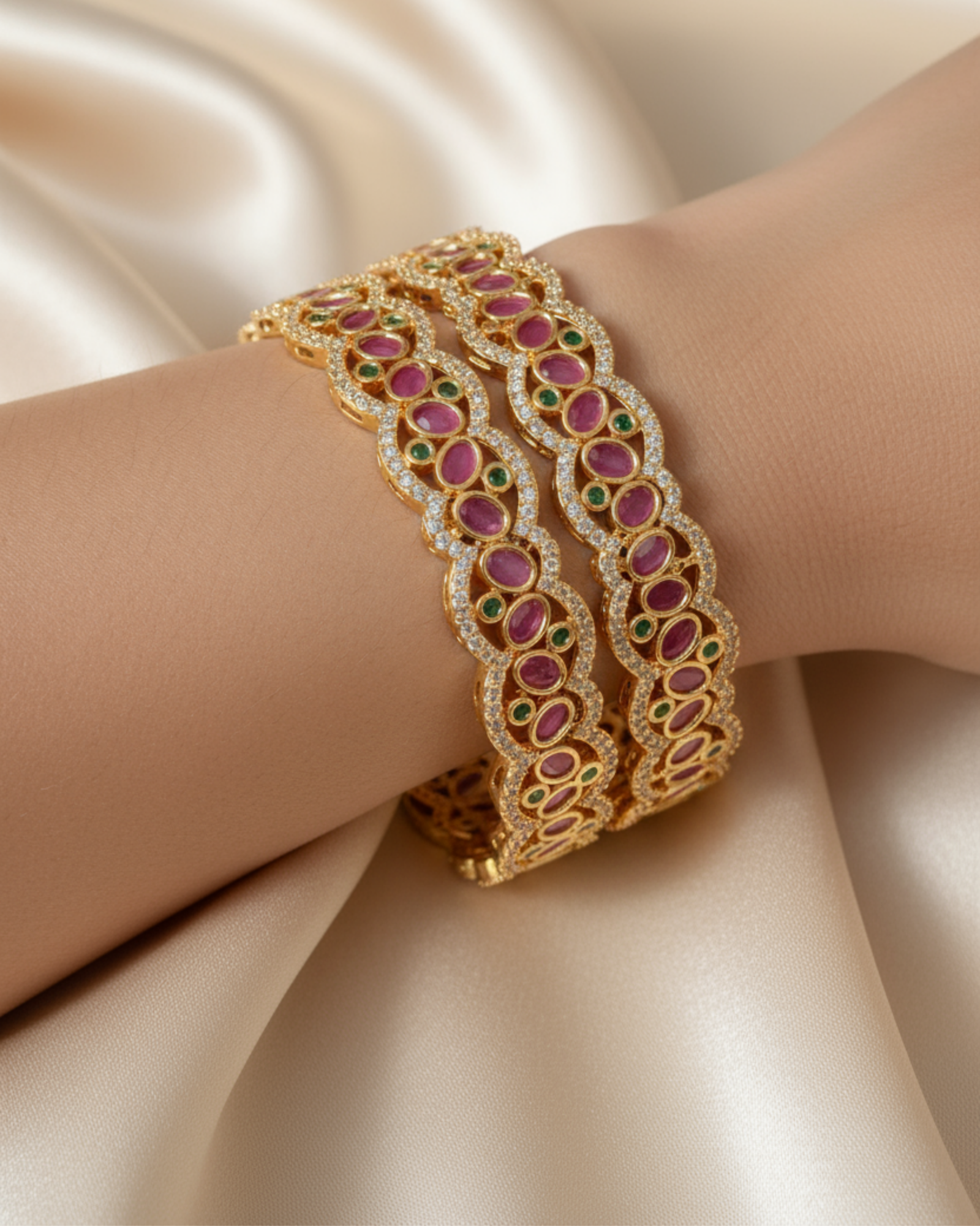 The Royal Ruby-Emerald Lace Bangles combine regal colour with intricate filigree detailing. Alternating emerald-green stones and ruby-pink floral clusters are framed in shimmering CZ halos, creating a rich, heritage-inspired look perfect for weddings and festive occasions.