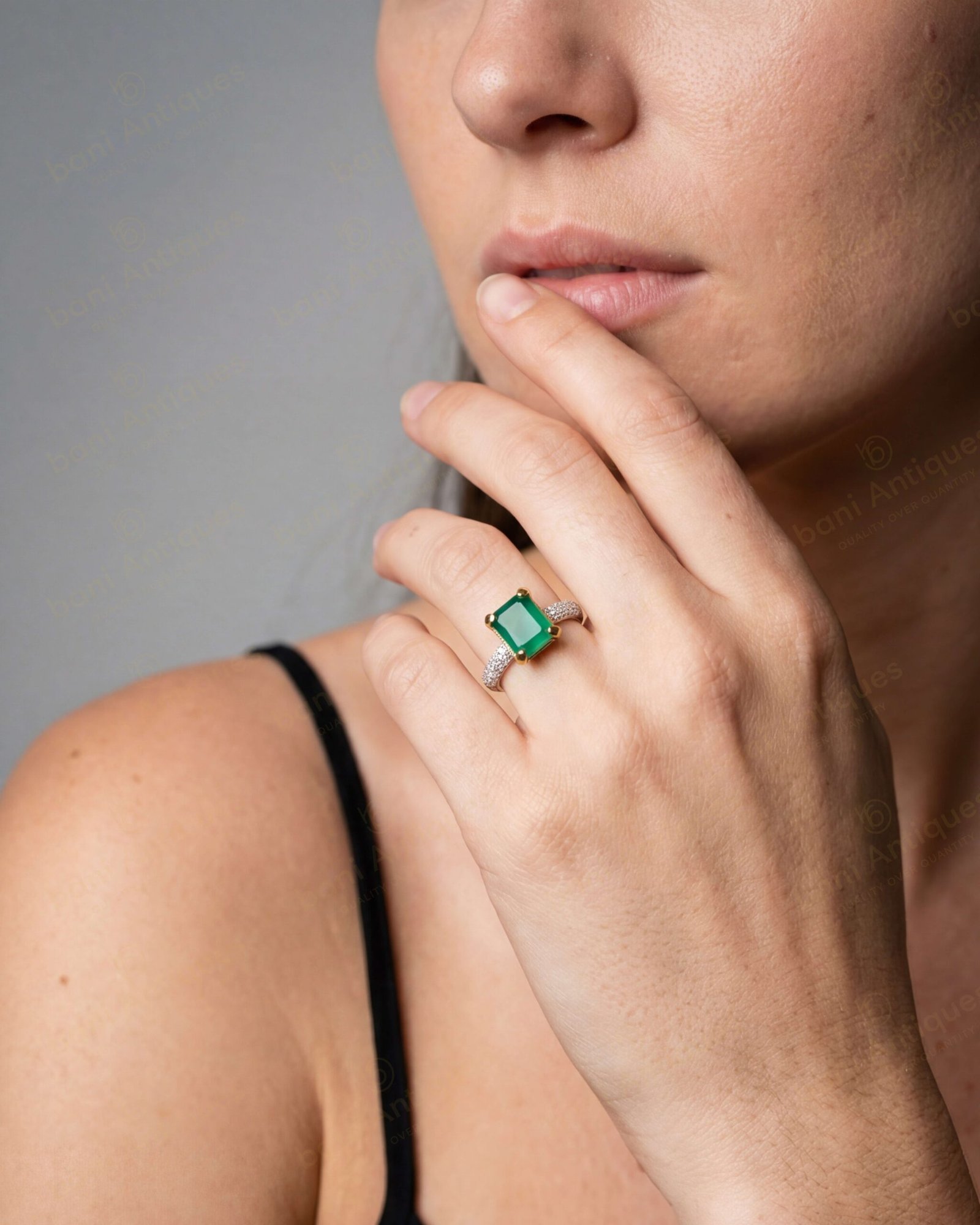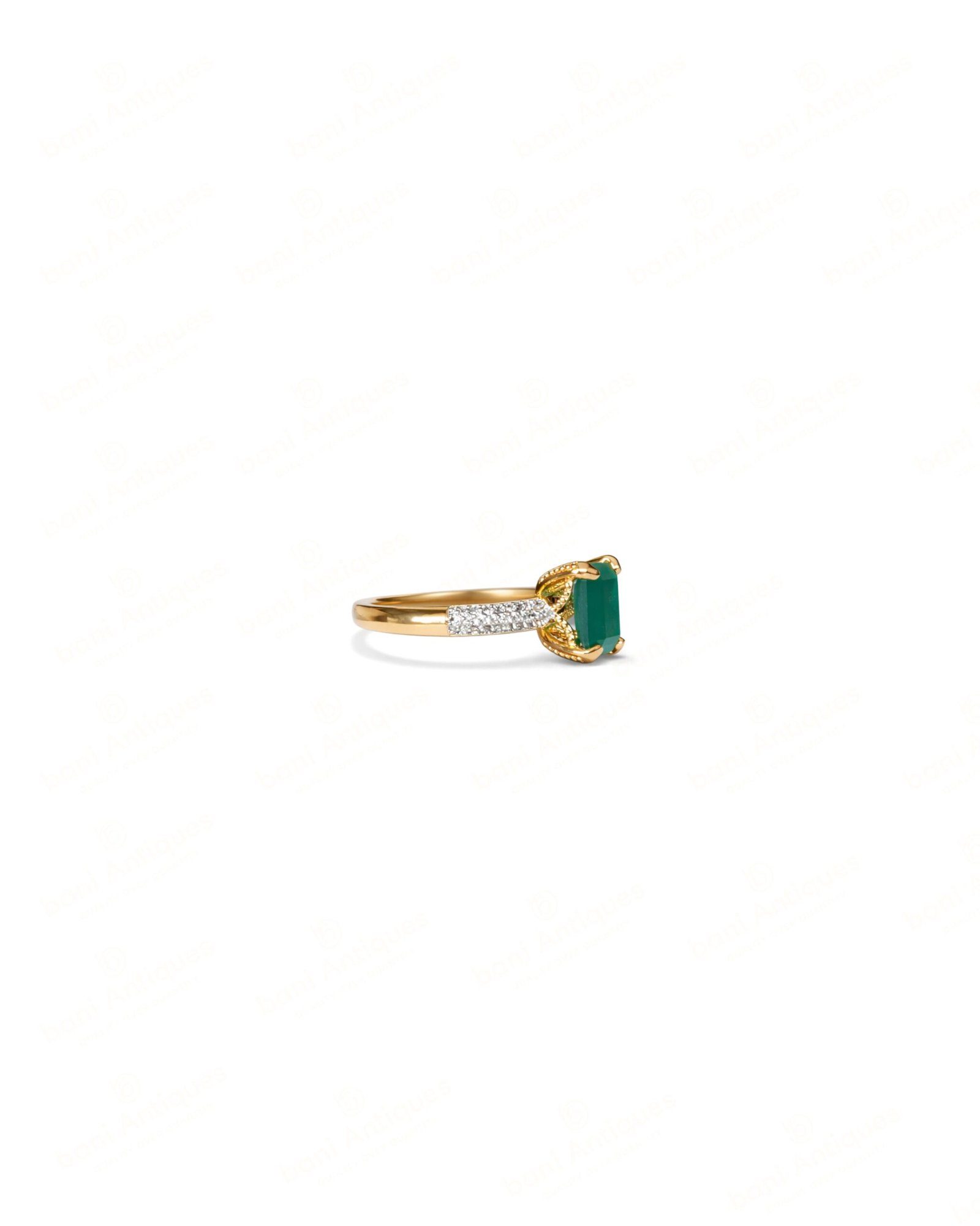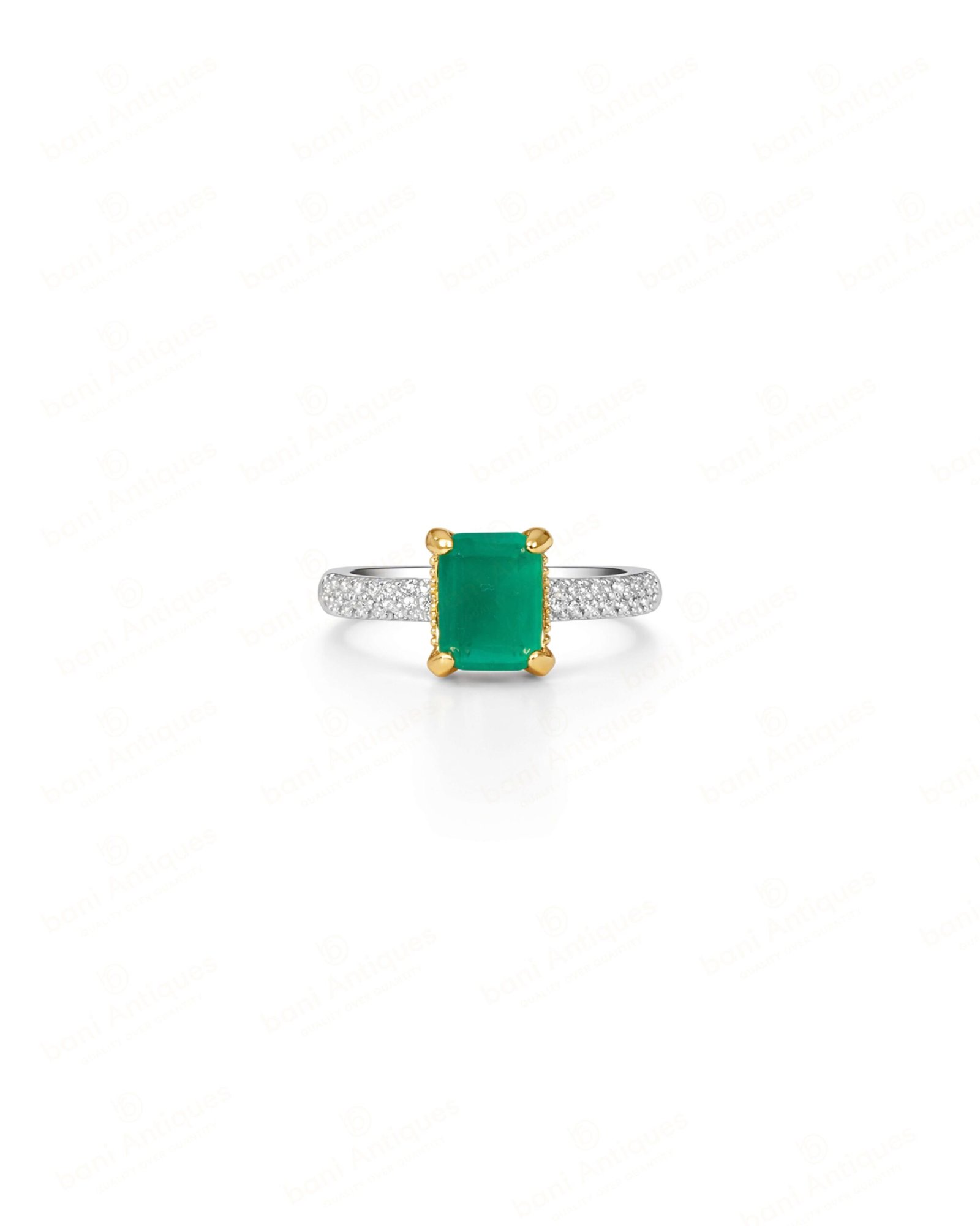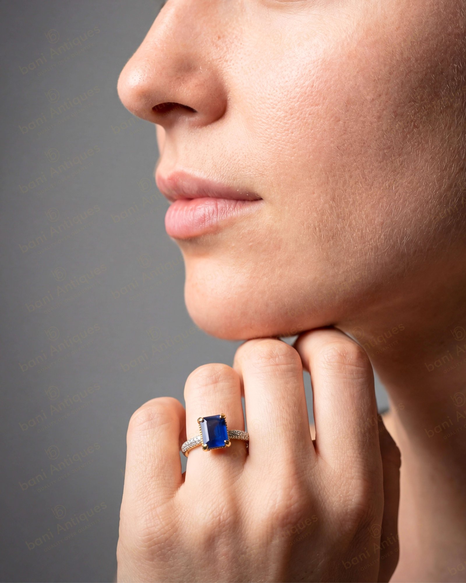 18k yellow gold–plated ring featuring an emerald-cut center stone accented by round brilliant-cut American diamonds along the band. With its classic silhouette and striking sapphire–gold contrast, it offers an elegant, timeless look for women.